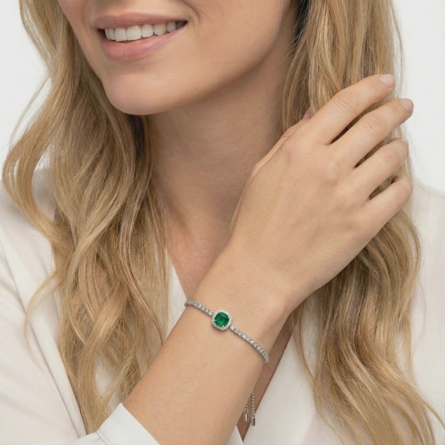On saleSterling silver bolo bracelet with a cushion-cut simulated emerald in a halo setting on green velvet with leaves.