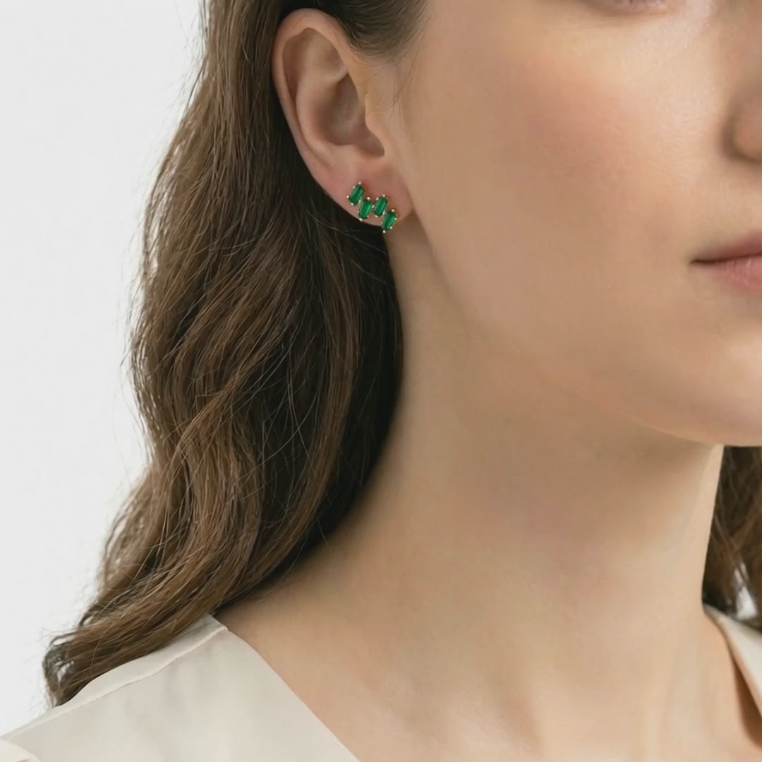 On saleMacro view of geometric taper cut simulated emeralds in 18K gold vermeil earrings on green velvet.