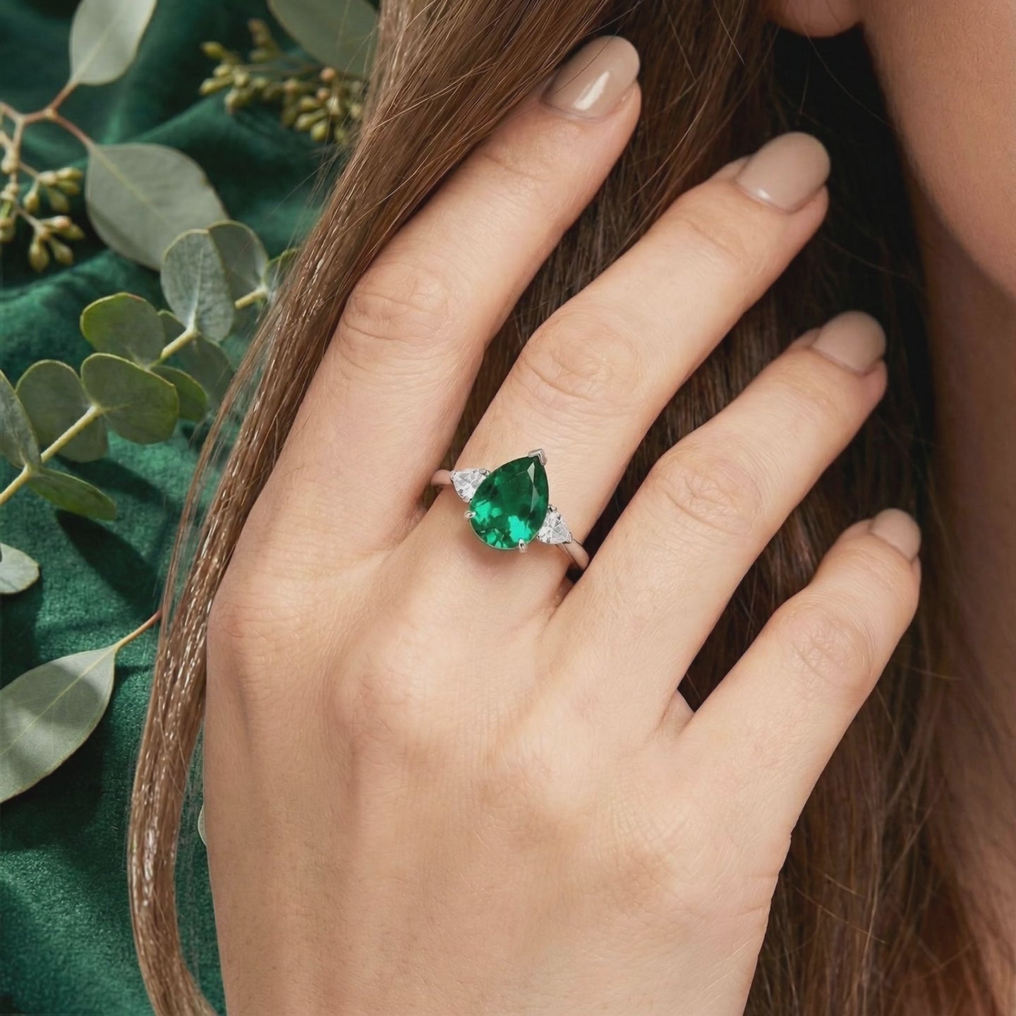 On salePear cut simulated emerald ring in S925 sterling silver with trillion accents on green velvet.