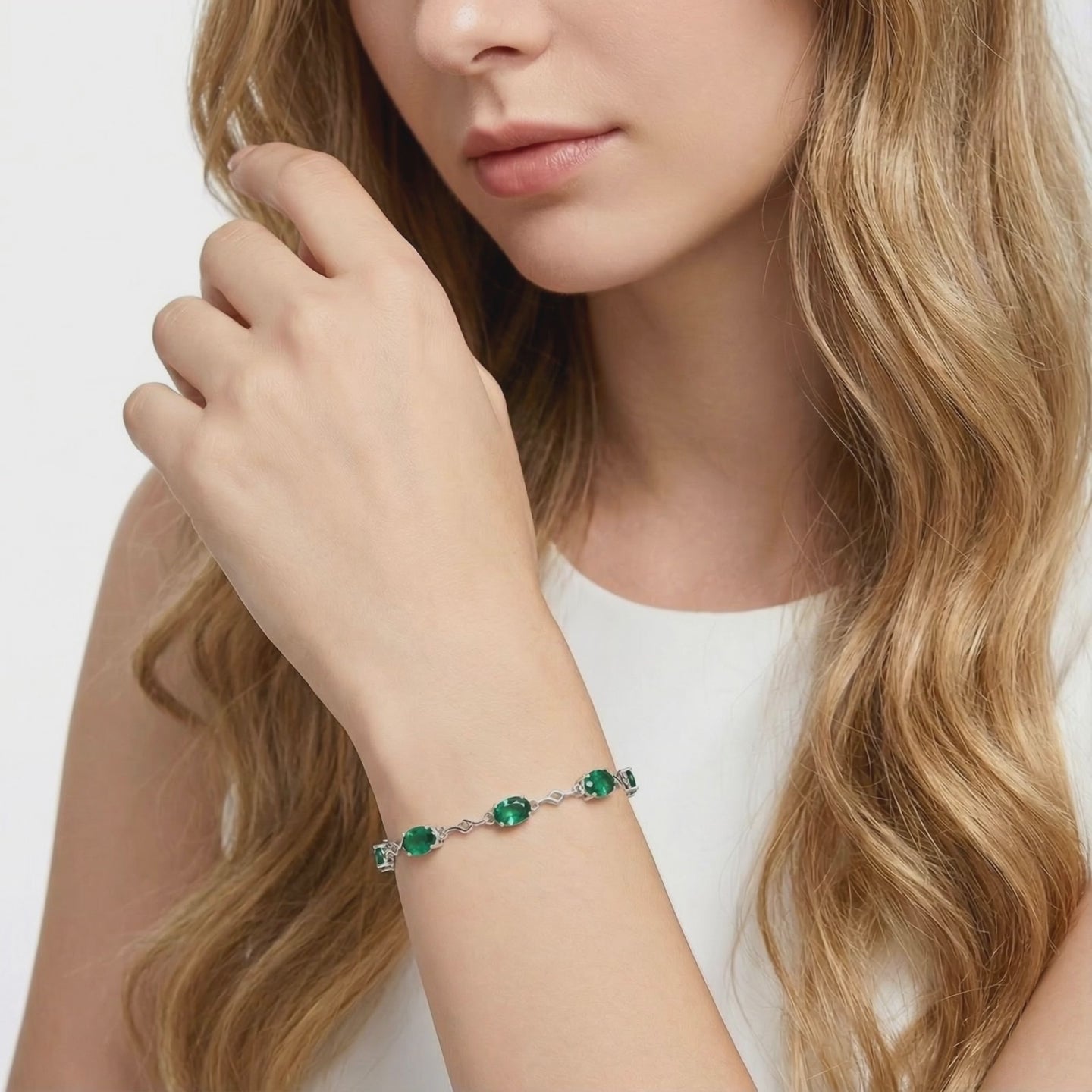 On saleS925 sterling silver station bracelet with oval simulated emeralds on green velvet with eucalyptus leaves.