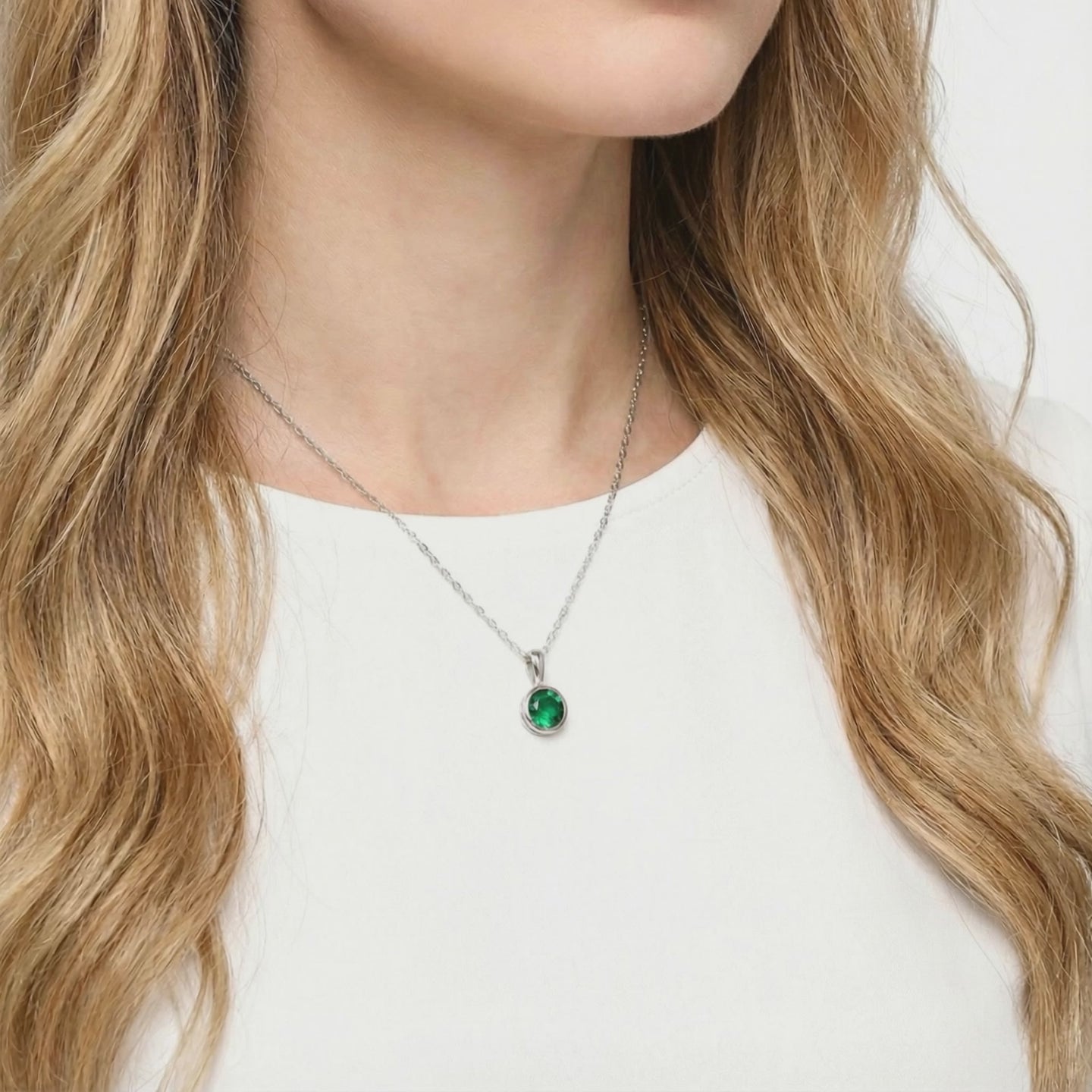 On saleRound simulated emerald bezel necklace in S925 sterling silver on green velvet with eucalyptus leaves.