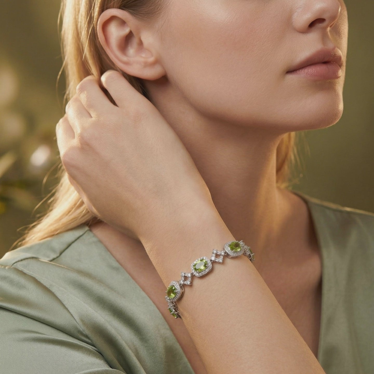 On saleCalianna oval-cut natural peridot bracelet in S925 sterling silver, styled on green silk with olive leaves.