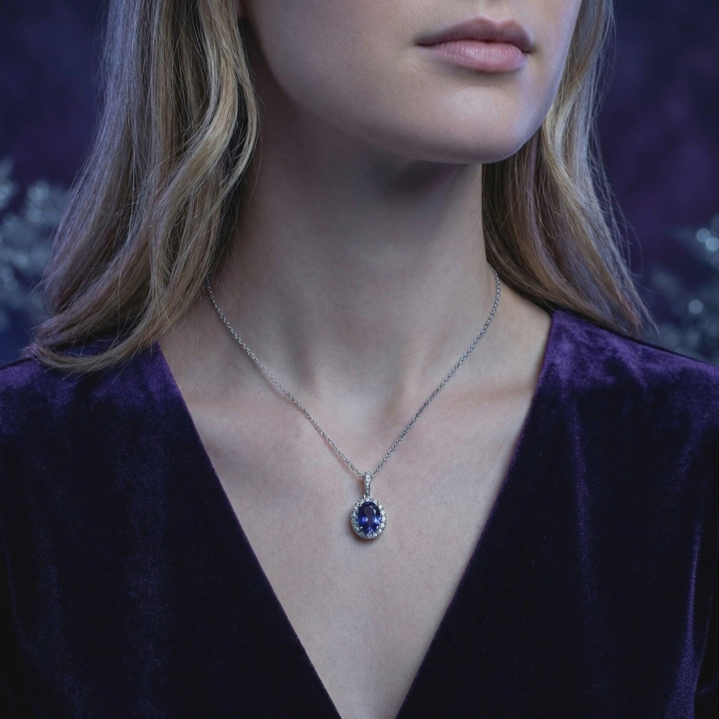 On saleOval simulated tanzanite halo necklace in sterling silver on purple velvet with decorative snowflakes.