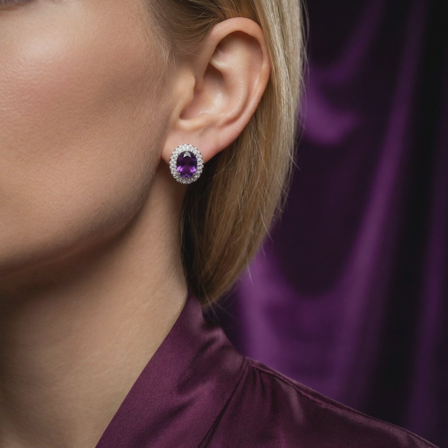 On saleOval cut natural amethyst halo earrings in sterling silver on purple silk with lavender accents.
