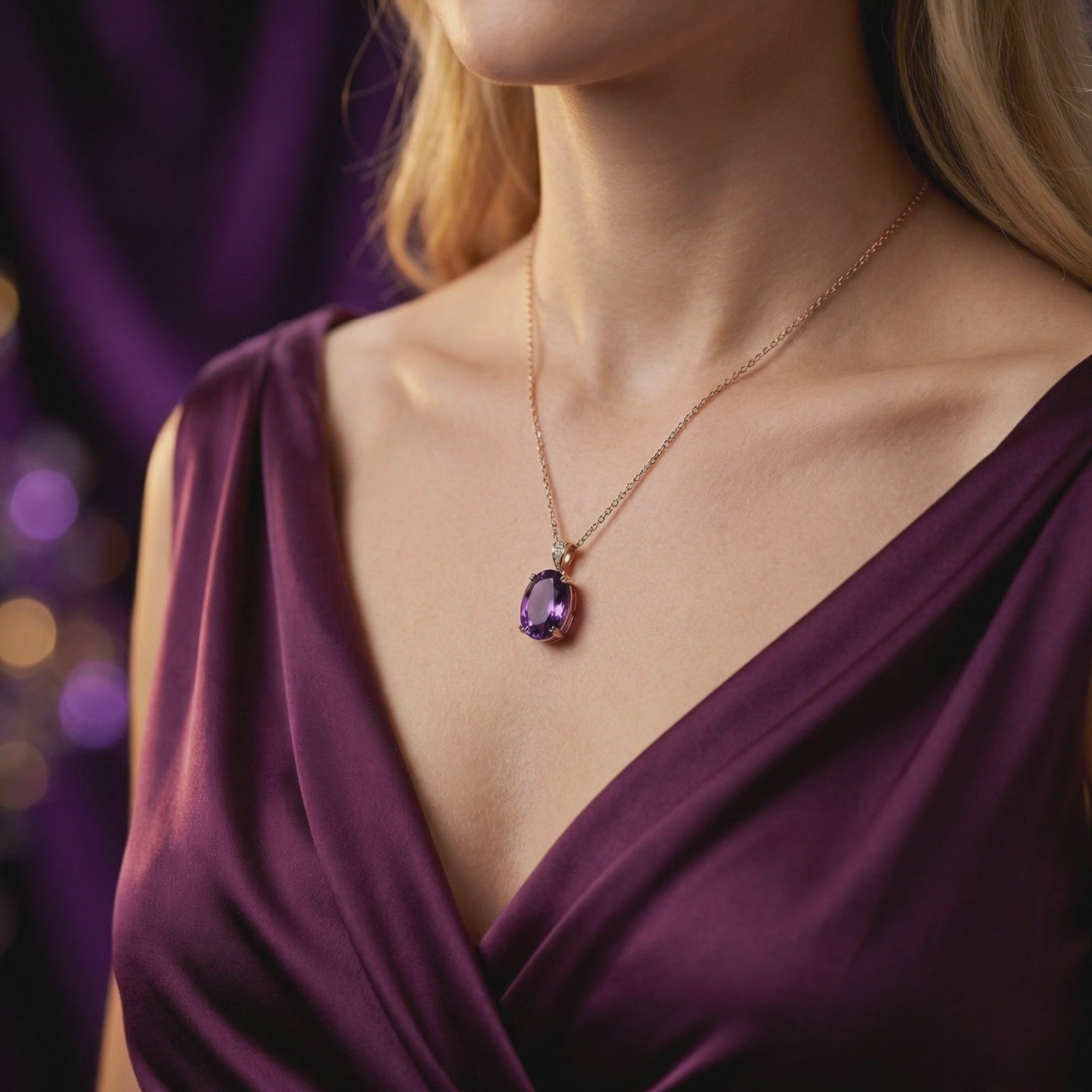 Save $690.00Oval cut natural amethyst pendant in 18k rose gold on a purple silk background with lavender sprigs.