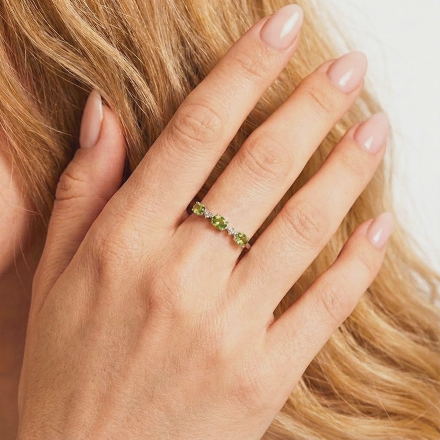On saleS925 sterling silver Mirabelle bypass ring with oval-cut simulated peridots on a lifestyle background with lime.
