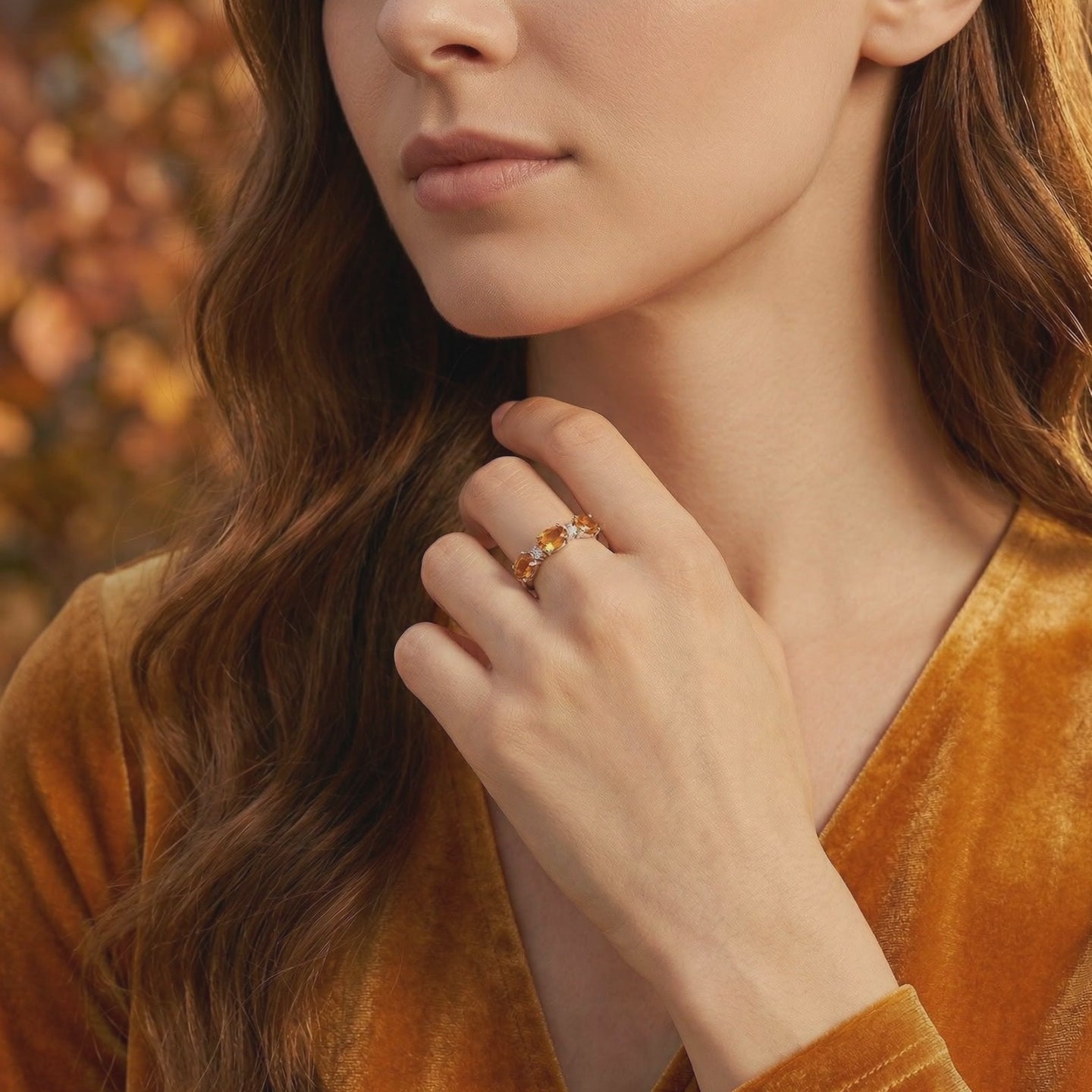 On saleEvalise bypass ring in S925 sterling silver with oval-cut simulated topaz stones on an autumn leaf background.