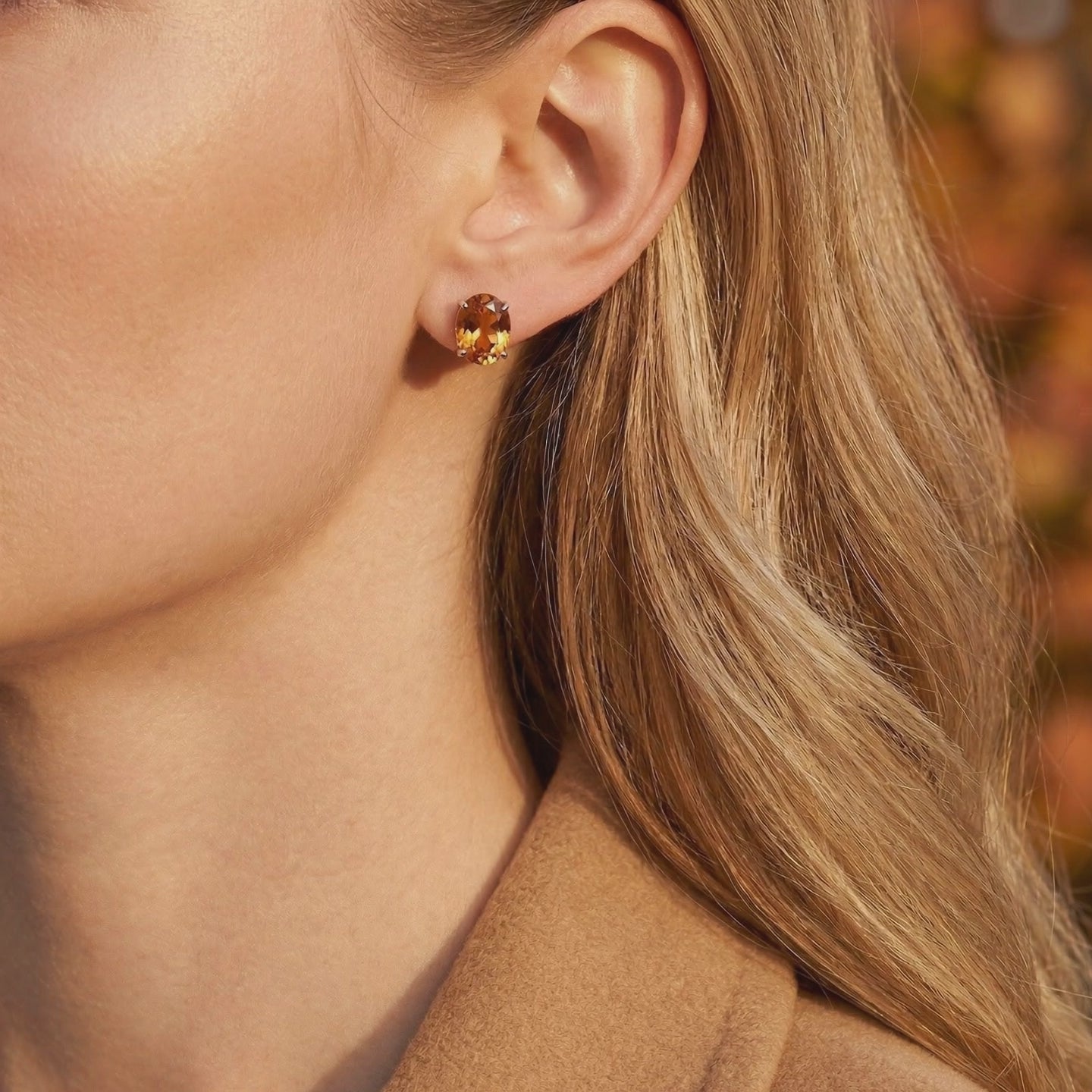 On saleOval honey-colored simulated topaz halo stud earrings in S925 sterling silver on brown velvet with autumn leaves.