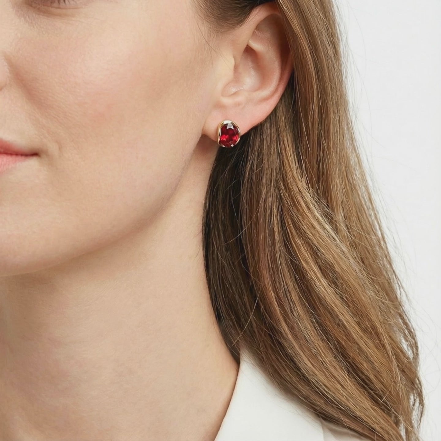 On saleOval-cut simulated ruby stud earrings in sterling silver resting on draped red satin fabric.