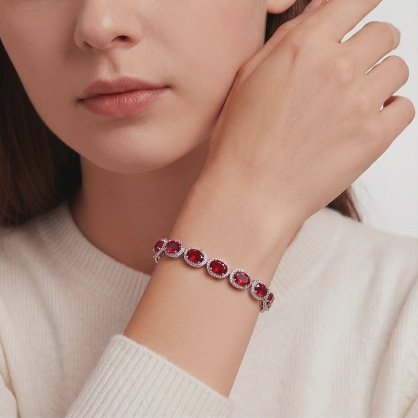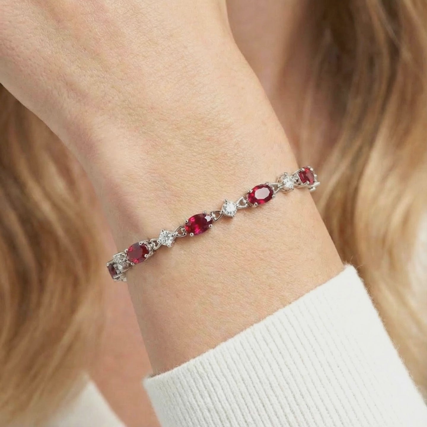 On saleOval-cut simulated ruby tennis bracelet in sterling silver displayed on red satin fabric.