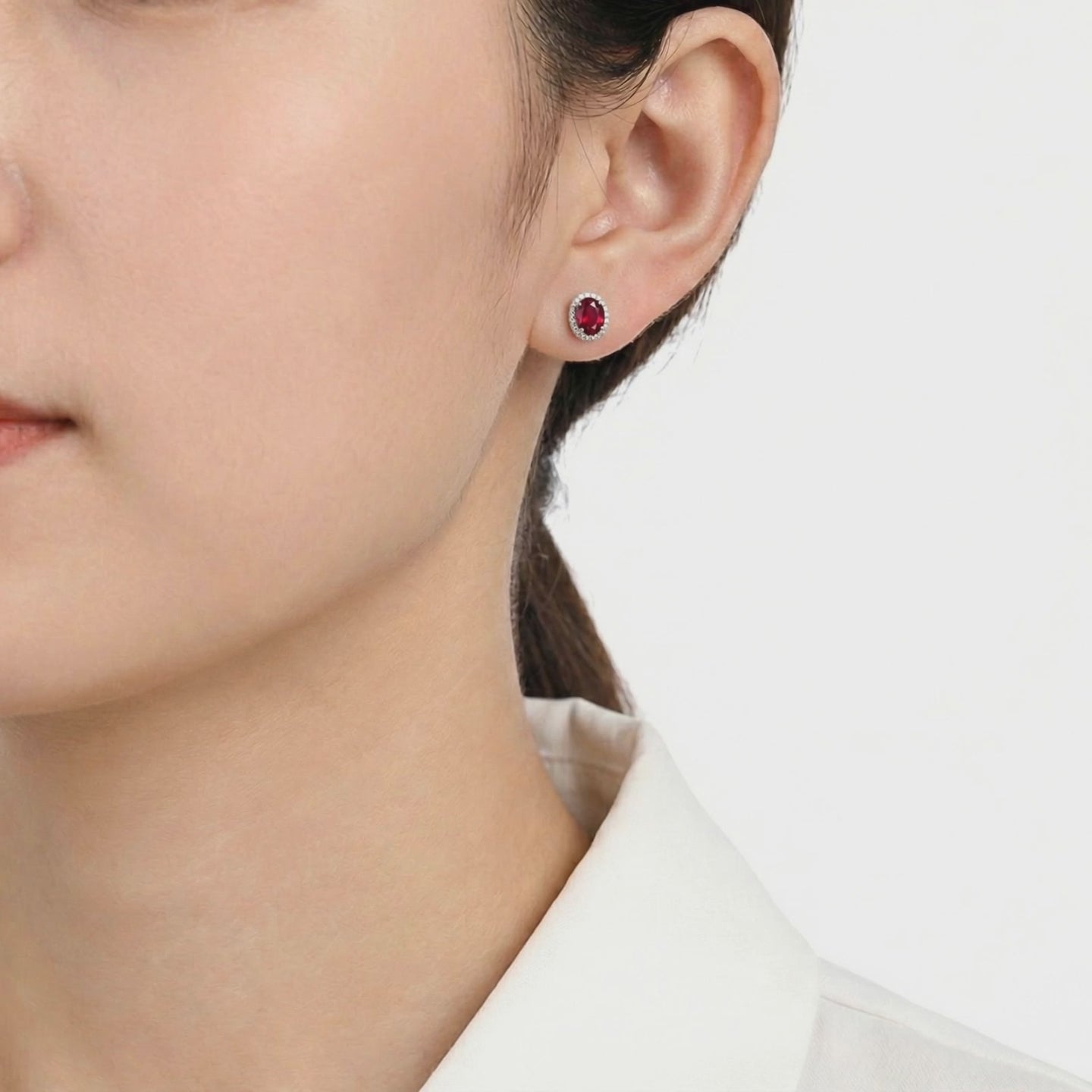 On saleOval simulated ruby halo stud earrings in S925 sterling silver resting on red satin fabric.