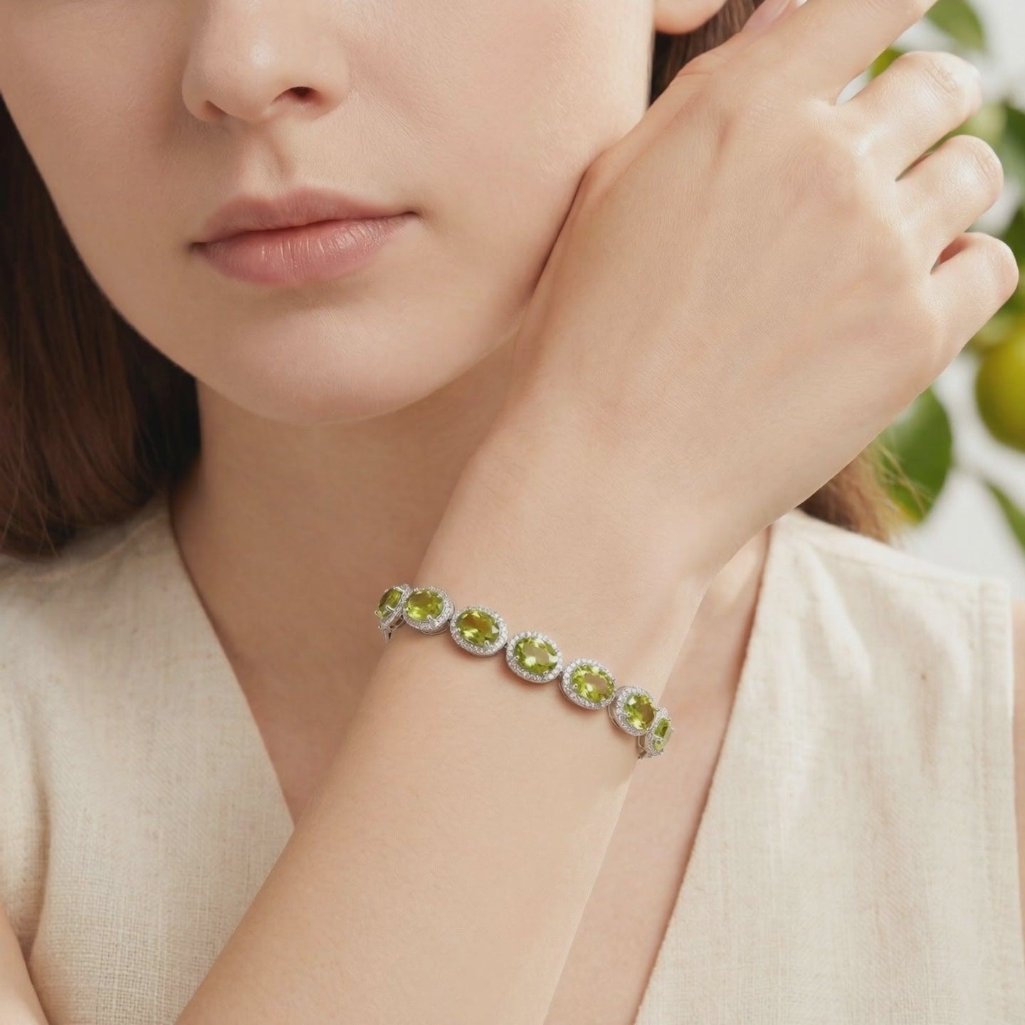 On saleSterling silver station bracelet featuring oval cut simulated peridot stones on a neutral lifestyle background.