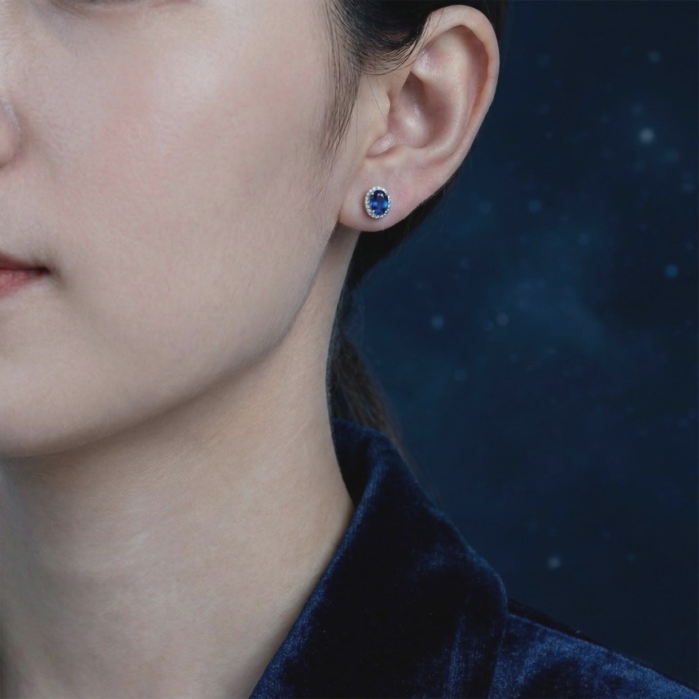 On saleOval cut simulated sapphire halo stud earrings in sterling silver on a dark blue velvet background.