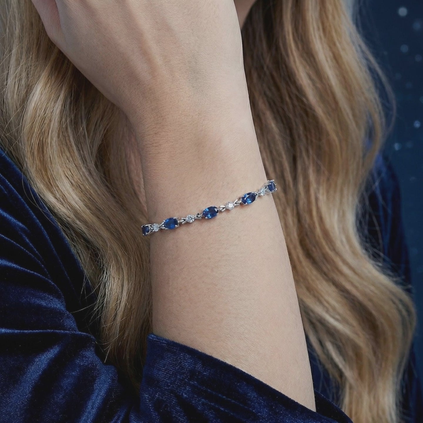 On saleOval simulated sapphire and sterling silver tennis bracelet on a dark blue velvet background.