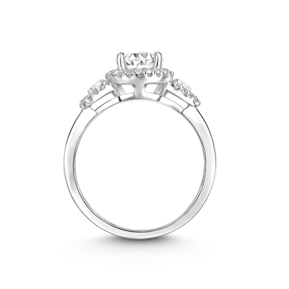A symbol of past, present, and future, this 3 stone moissanite ring is crafted for those who appreciate timeless beauty. The centerpiece features a dazzling 1-carat round-cut lab-grown moissanite, graded D, VVS, IFL for the highest brilliance and clarity. Flanked by two accent stones and encircled by a shimmering halo, this ring delivers exceptional fire and sparkle from every angle.
