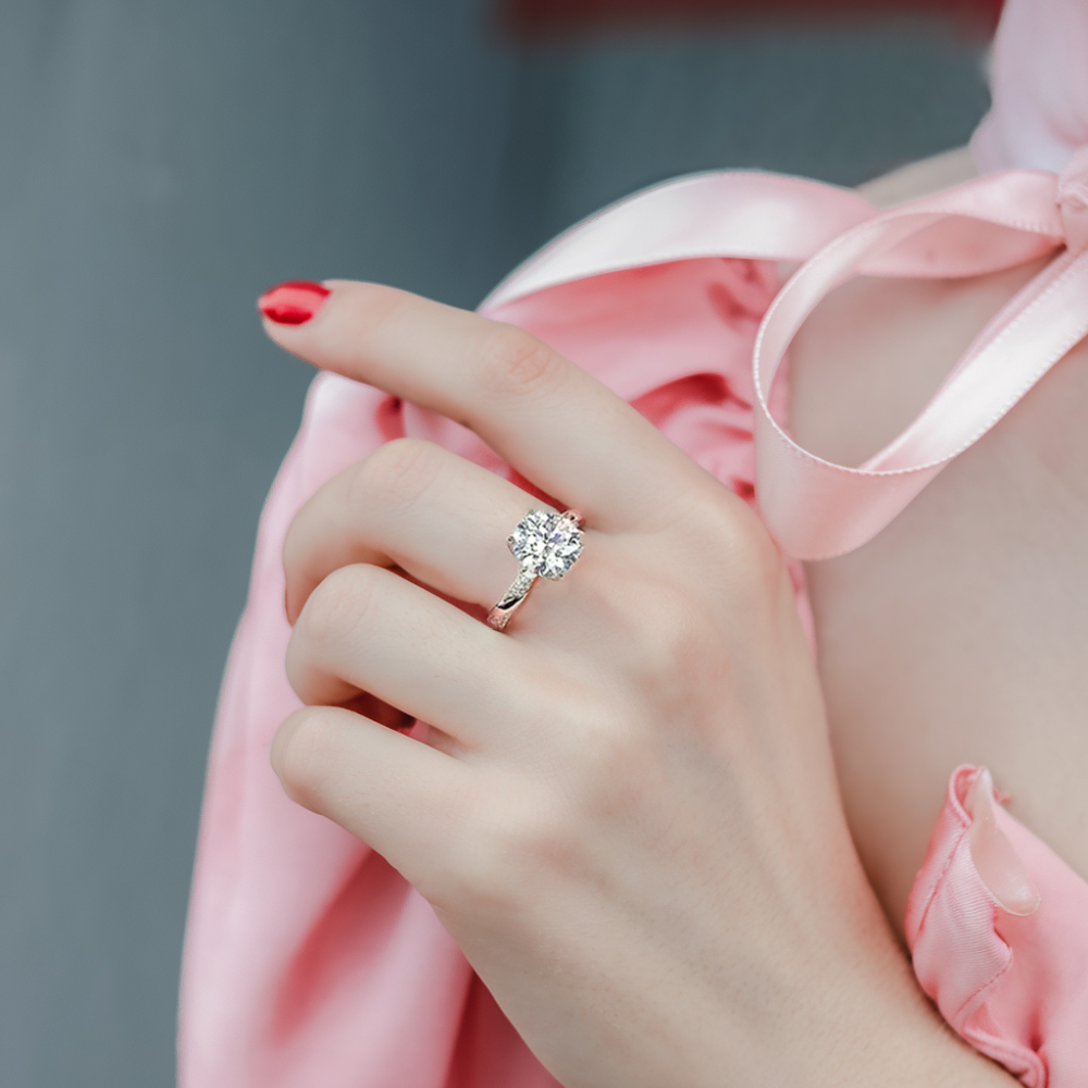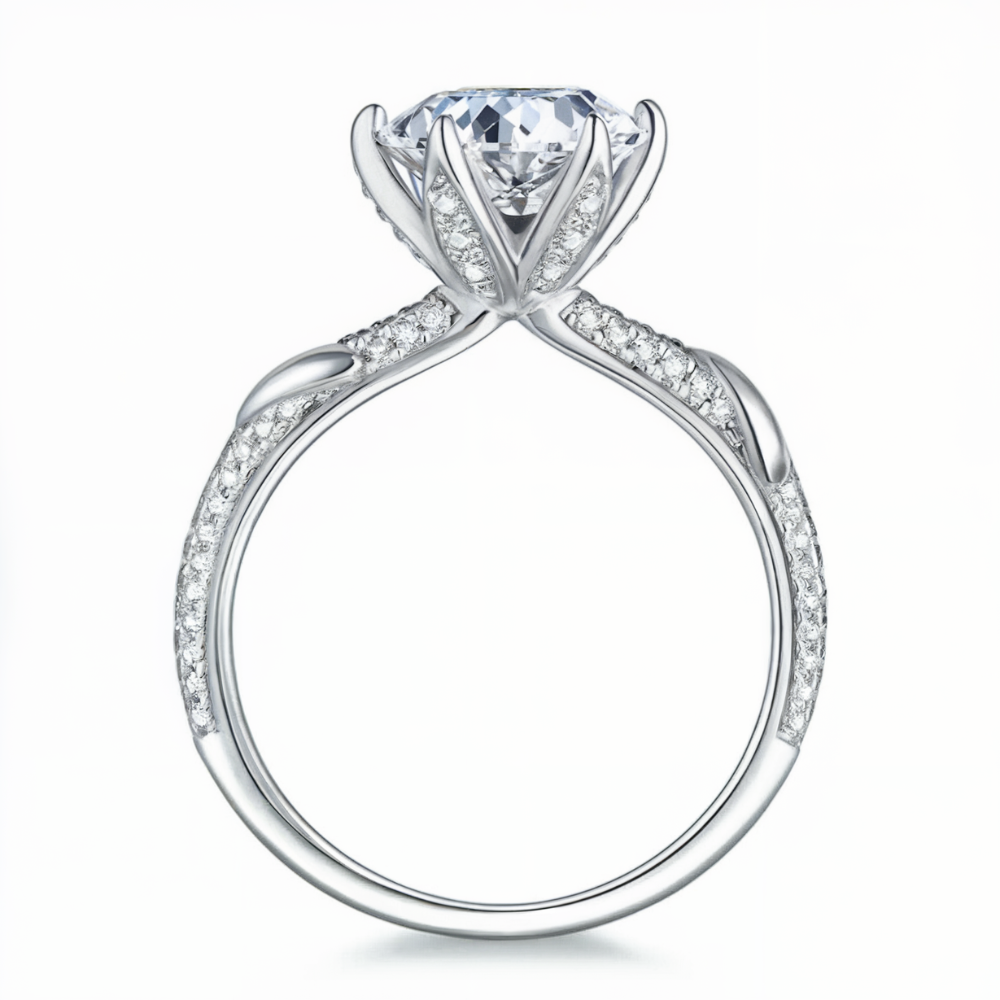 This affordable moissanite engagement ring features a stunning 3CT lab-grown moissanite center stone with a round cut, maximizing brilliance. Available in S925 sterling silver, platinum vermeil, or 14K/18K solid white gold, it offers luxury at an affordable price.