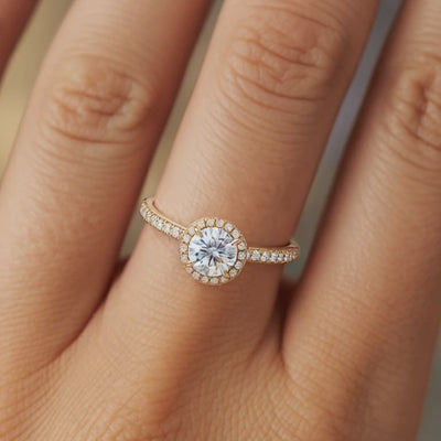 This isn't your typical solitaire. Our halo design takes the classic 1CT round moissanite and encircles it with a crown of sparkle, making your center stone appear even larger. The result? A ring that catches light from every angle while the D-color, VVS clarity center stone delivers more fire than any diamond.