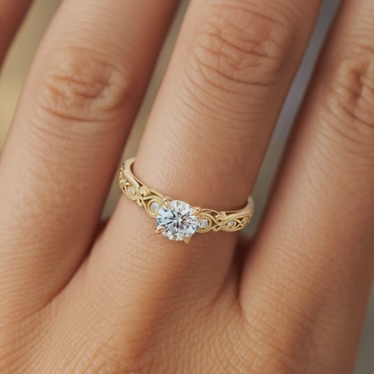This isn't your typical solitaire. Our vintage-inspired design takes the classic 1CT round moissanite and infuses it with timeless charm. The result? A ring that catches light from every angle while the D-color, VVS clarity center stone delivers more fire than any diamond.