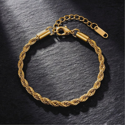 The Classic Rope Bracelet in Gold. It's crafted from durable 316L stainless steel and finished with a beautiful gold tone. This bracelet adds a subtle touch of class to any look.