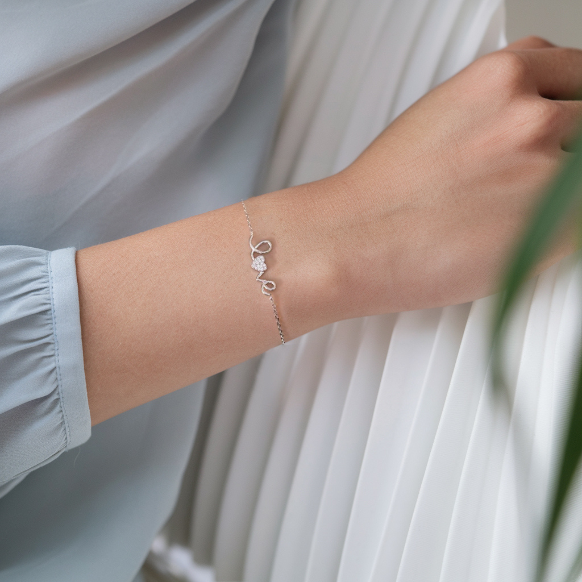 Wear a little reminder of love every day with this Diamond Encrusted Love Bracelet, a delicate yet meaningful piece that’s perfect for Valentine’s Day or any occasion. The bracelet features a dainty script spelling “love,” accented with a sparkling heart encrusted with lab-grown diamond simulants for an elegant touch.