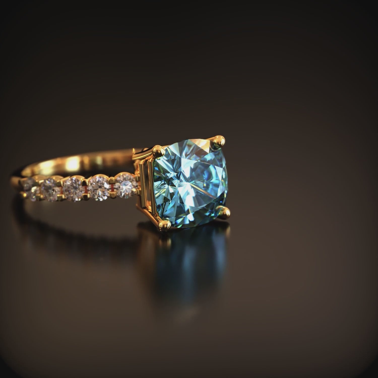 This ring makes you feel like you're gazing into the heart of a crystal-clear ocean. At its center sits a cushion-cut moissanite so vibrant and blue that it's like wearing a piece of the sea on your finger.