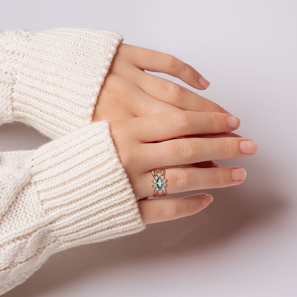 This ring is made of shiny silver with 4 layers of rose gold. It combines classic style with a modern look. At its heart, an oval-cut synthetic diamond takes center stage, shining just like the real thing. It's designed with accent stones of our ethically sourced synthetic diamonds. This creates a dance of light with every flicker of movement.