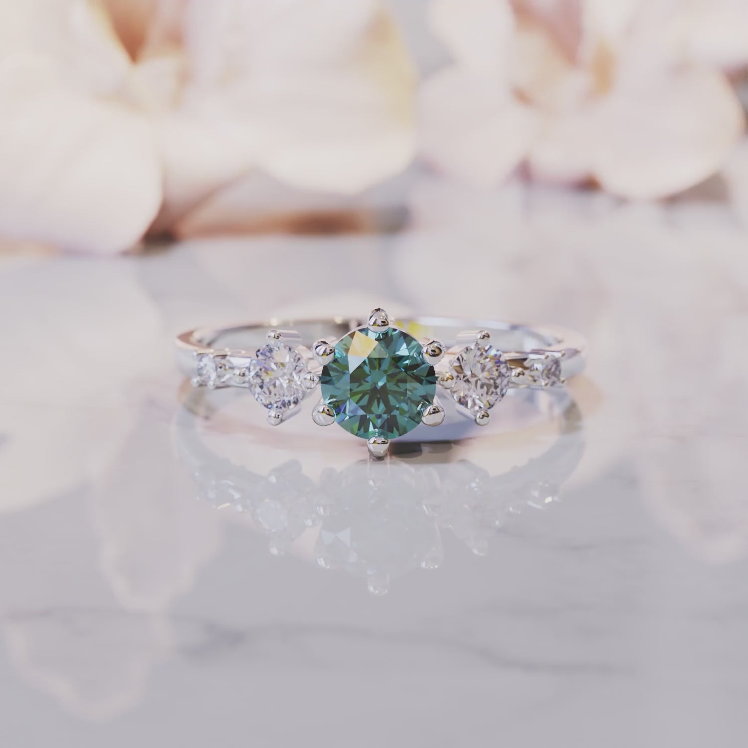 At the center of this ring is a 0.8-carat round Alexandrite, a gemstone that’s anything but ordinary. It shifts from greenish-blue in daylight to purples and reds under softer lighting—it’s like having two rings in one! On either side, you’ve got two brilliant lab-grown diamonds, adding extra sparkle to this meaningful three-stone design.
