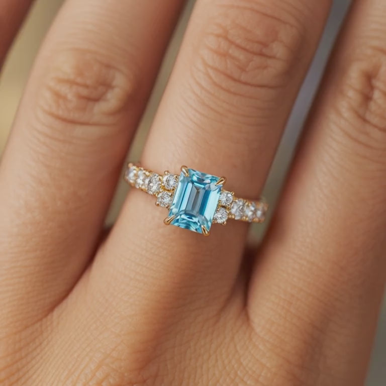 Ocean depths meet diamond fire with our breathtaking 2CT emerald-cut blue moissanite. This stunning blue stone catches eyes and starts conversations, capturing light like no other for a look that's both luxurious and affordable. The band is adorned with pavé side stones, adding an exquisite touch that complements the centerpiece.