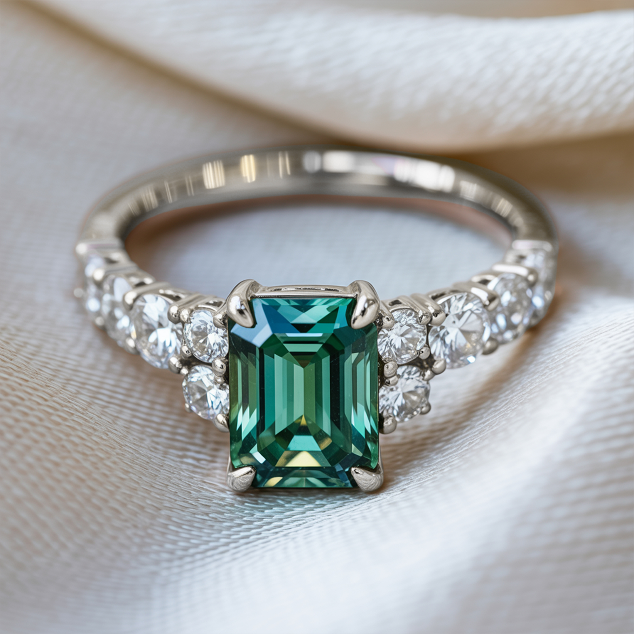 With breathtaking emerald-cut green moissanite that brings an exotic elegance to any outfit, this ring is both luxurious and affordable. The band is adorned with pavé side stones, adding an exquisite touch that complements the verdant centerpiece.