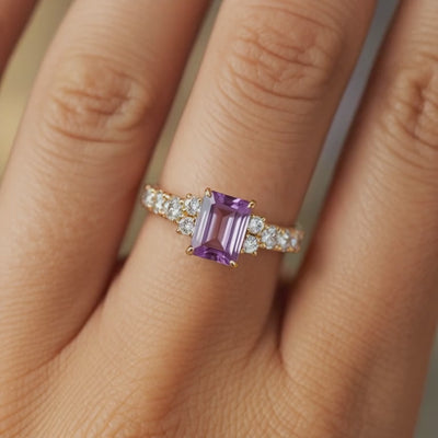 Royal elegance. The rich purple tone exudes luxury and individuality, making a statement that's uniquely yours. With breathtaking emerald-cut purple moissanite that captures the light like no other, this ring is both luxurious and affordable. The band is adorned with pavé side stones, adding an exquisite touch that complements the centerpiece. It's the ring that turns heads and invites admiration, offering a refined sparkle that speaks of understated sophistication.