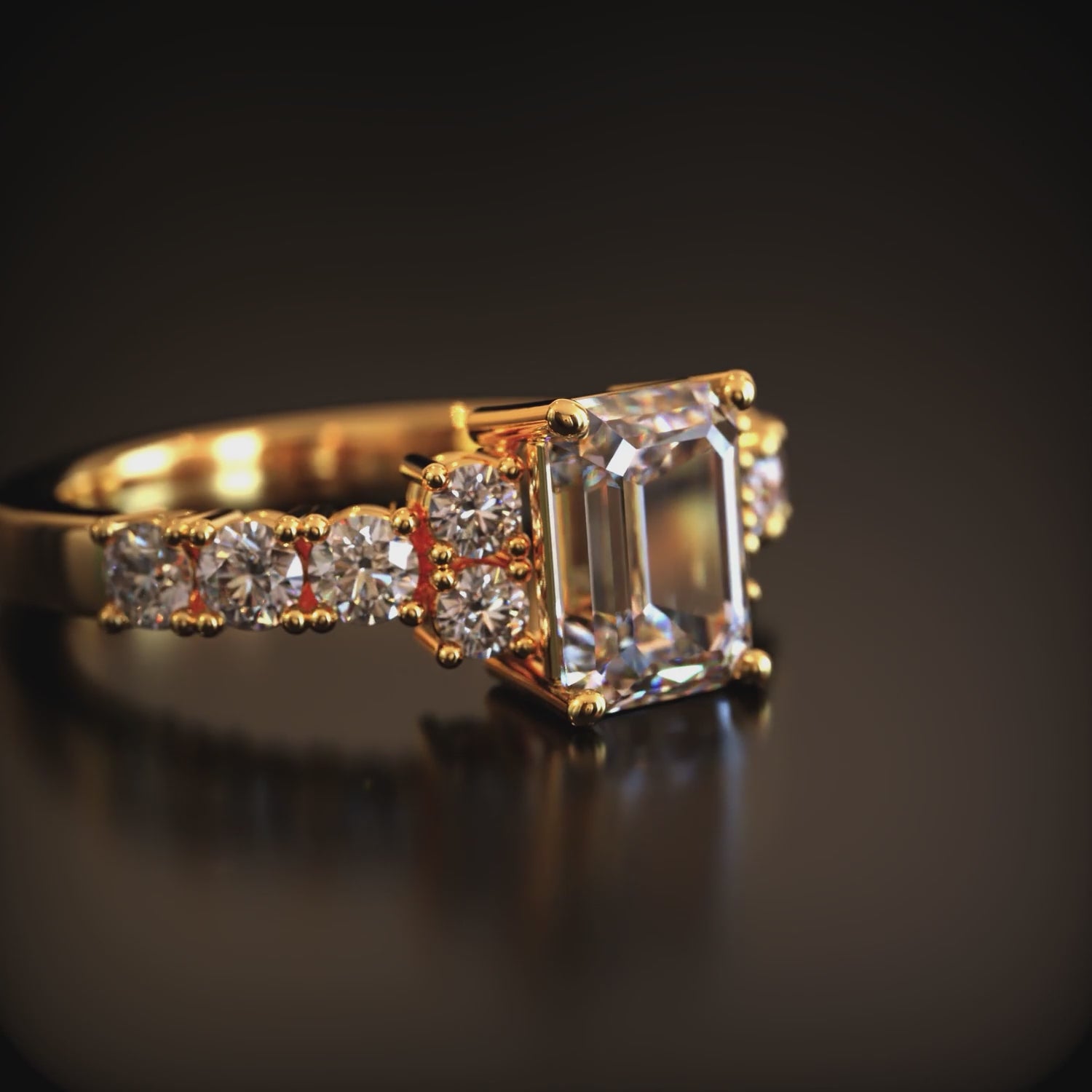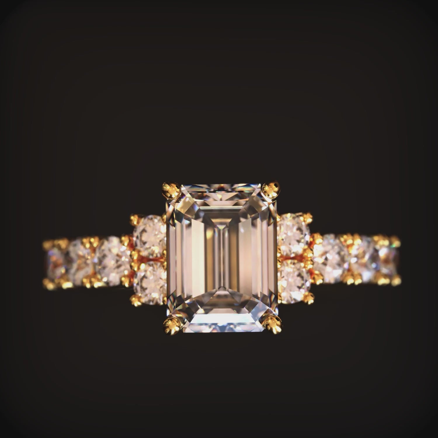 - CT Size: The Adelina Rae features a 2 CT Emerald Cut Moissanite. The side stones are round shape moissanites. We accept custom requests if you wish for a different CT size. Check the details above for specifics on this ring.