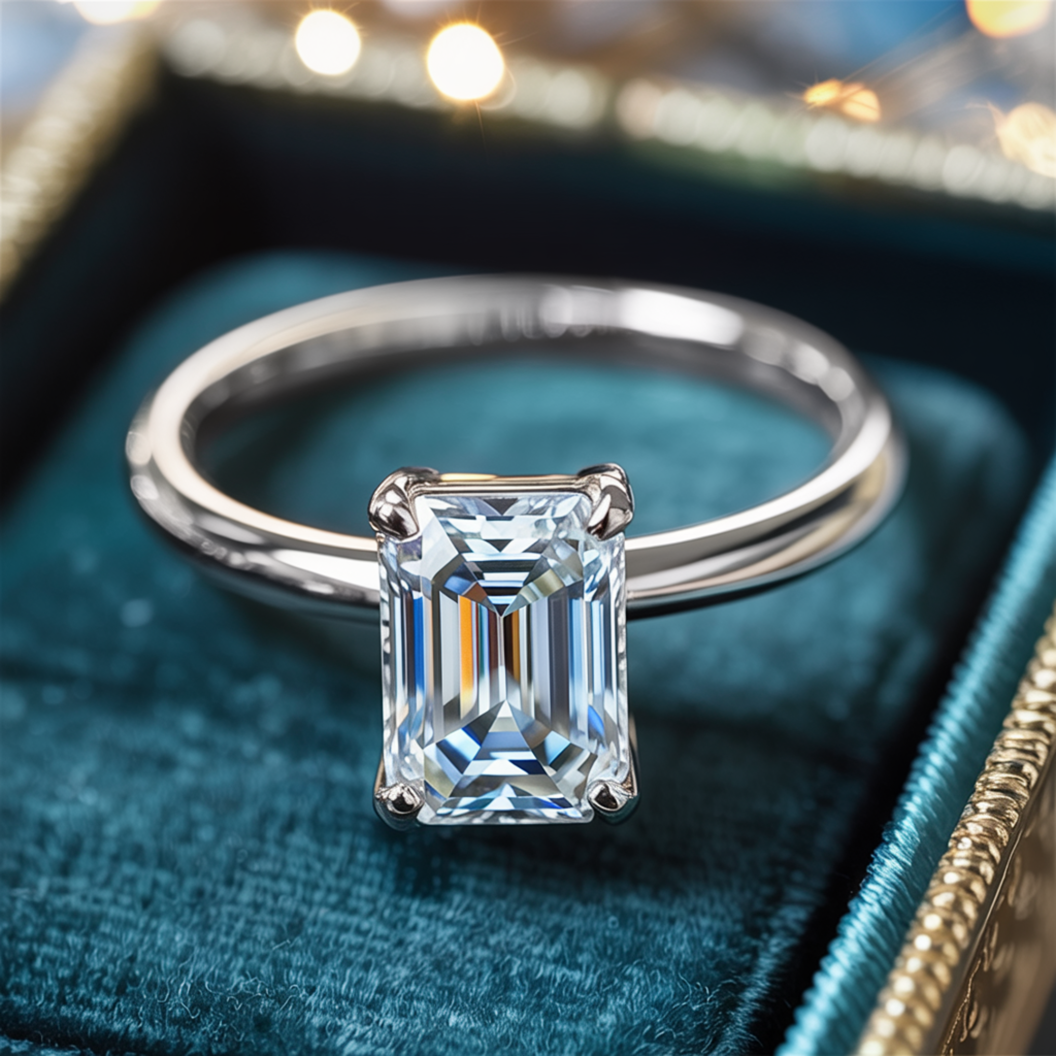 What outsparkles any diamond? The Adelina Rae Emerald Cut Moissanite Solitaire Ring. Say hello to The Adelina Rae, a ring that radiates light outsparkling even the finest diamonds. This is classic elegance that never goes out of style, where the breathtaking 2CT emerald-cut moissanite takes center stage, capturing the light like no other. This ring is both luxurious and affordable, designed to turn heads and invite admiration, offering a refined sparkle that speaks of understated sophistication.