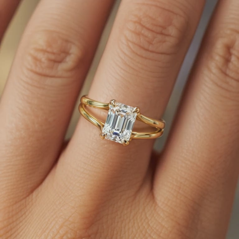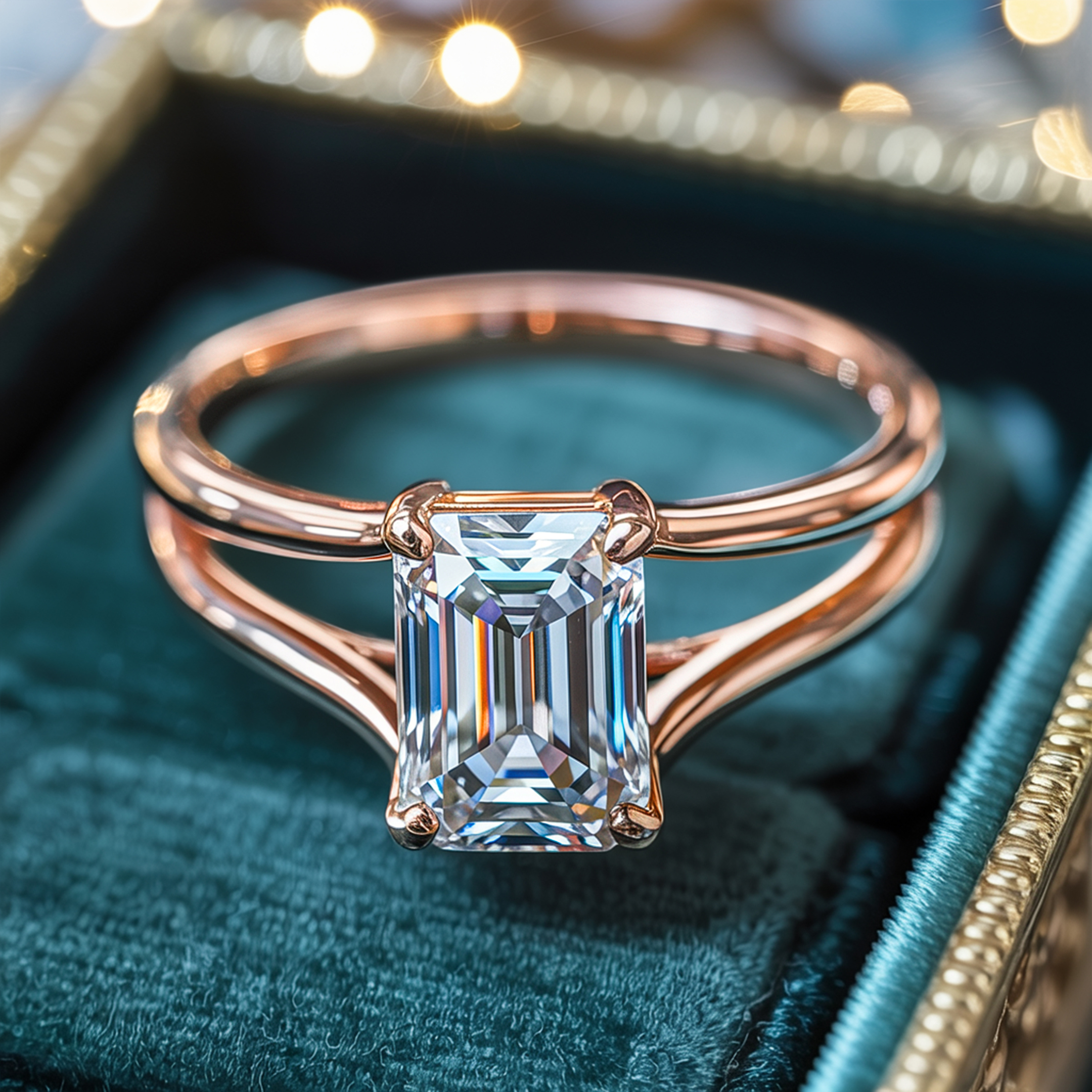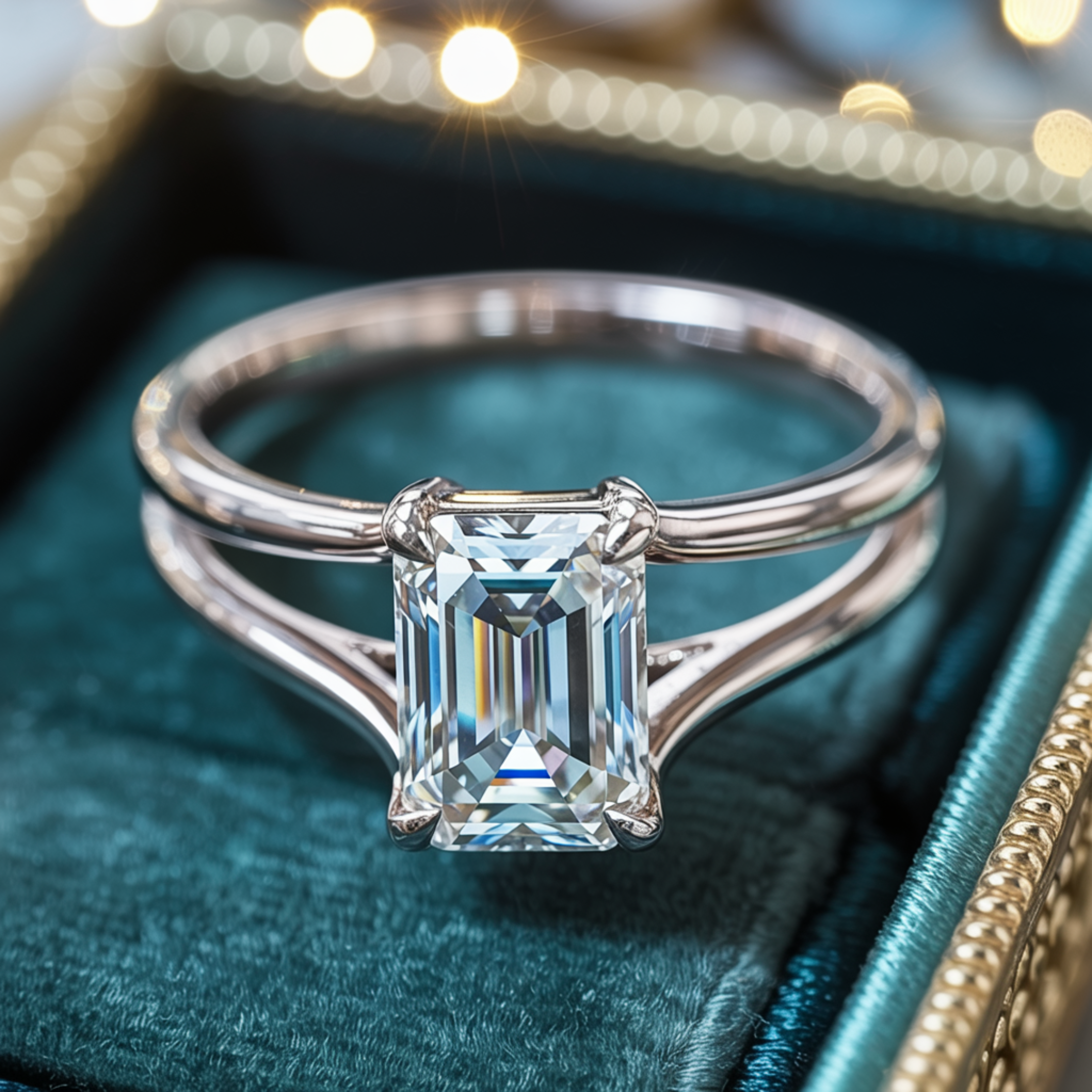 Featuring a breathtaking emerald-cut moissanite that captures the light like no other, this ring combines luxurious appeal with an accessible price. The distinctive split shank band offers modern sophistication, elegantly parting to embrace and accentuate the stunning centerpiece.