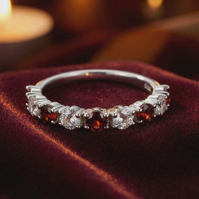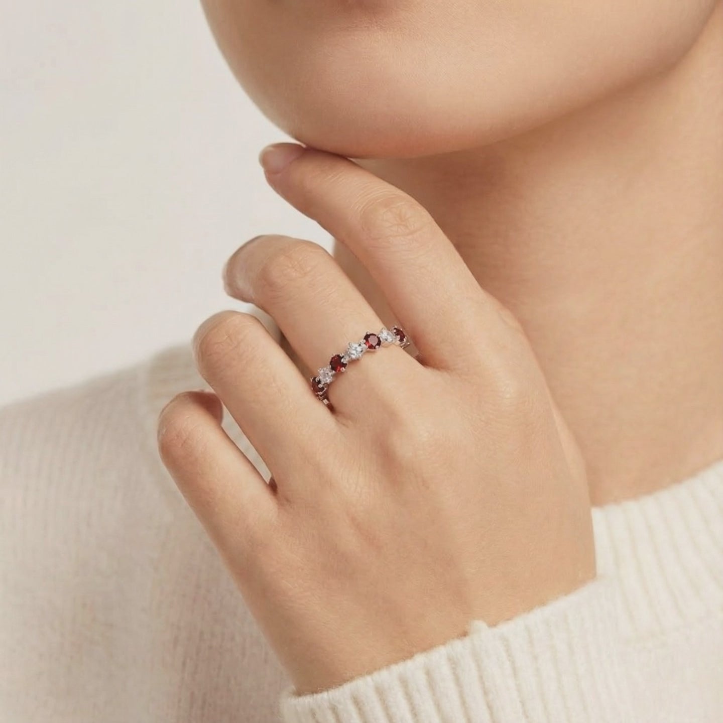 Nature rarely delivers the perfect deep red required for a museum-grade garnet. We engineered it. This eternity ring features a continuous band of precision-cut Simulated Garnets, color-calibrated to the absolute ideal of the January birthstone. Each stone is faceted for maximum light return and uniform brilliance.