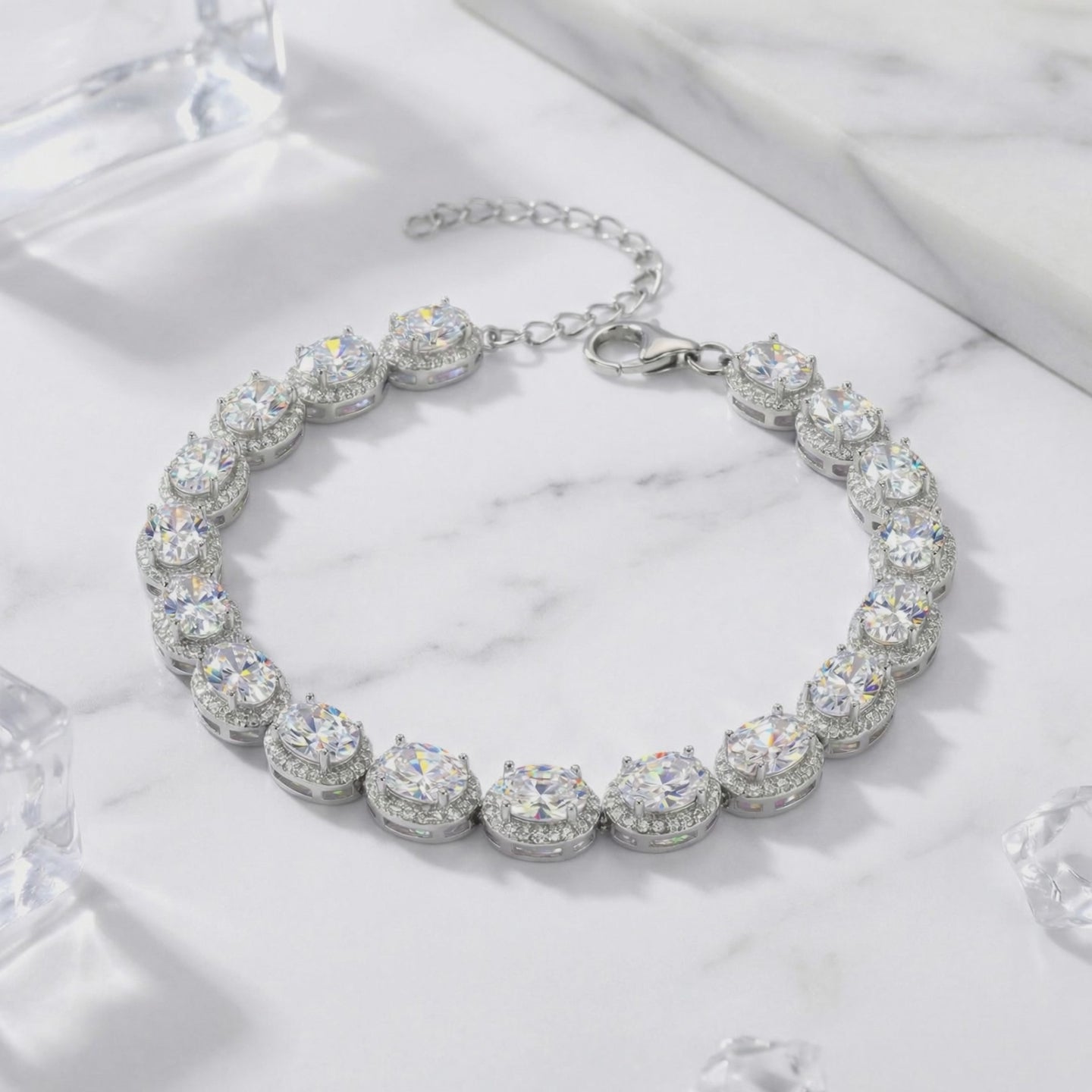 Each oval-cut 5A Zirconia stone is precision-set in a protective halo of brilliant accents to maximize light return. Engineered for the grind of daily life, the mounting is forged from Solid 925 Sterling Silver and finished with a Platinum-family Rhodium layer to resist tarnish and maintain a mirror-like shine. This tennis bracelet features a reinforced clasp and an adjustable 19+4cm chain to ensure a secure and comfortable fit on any wrist.