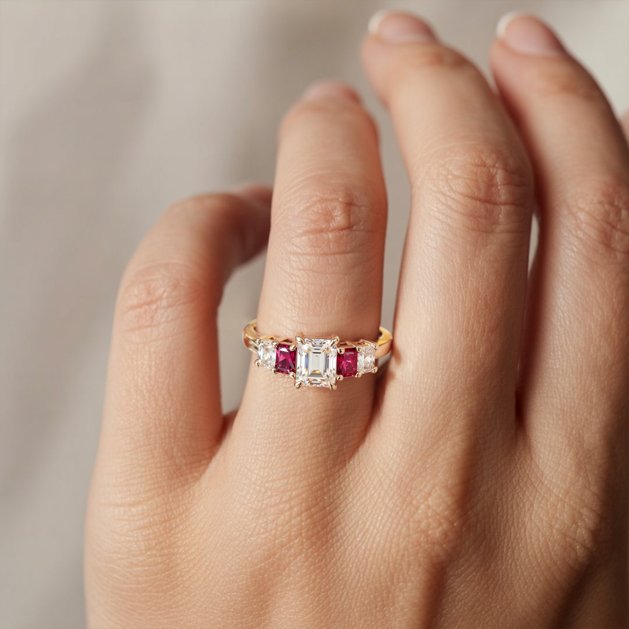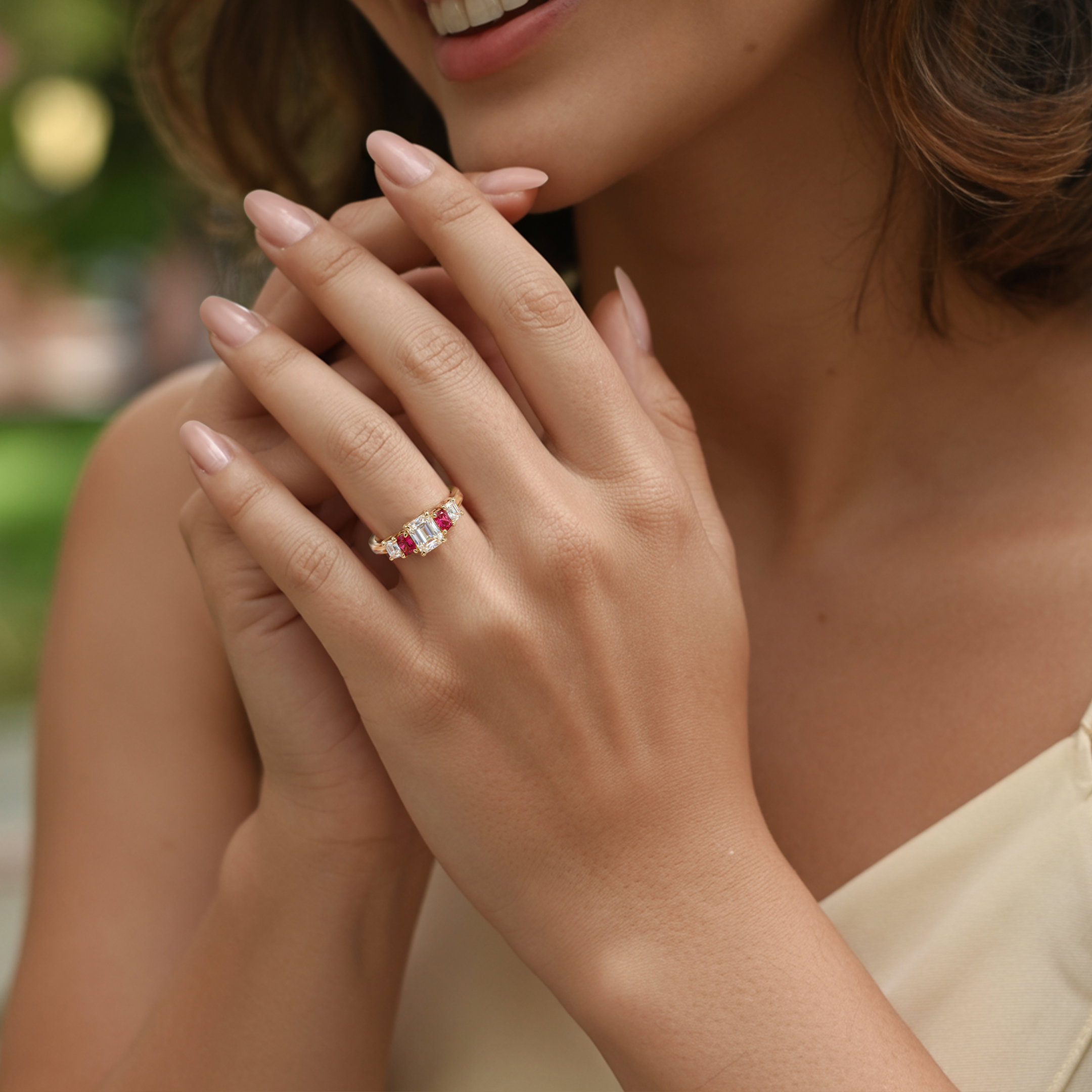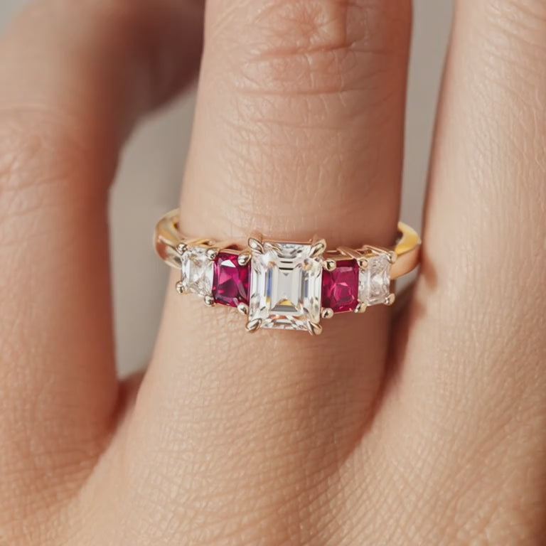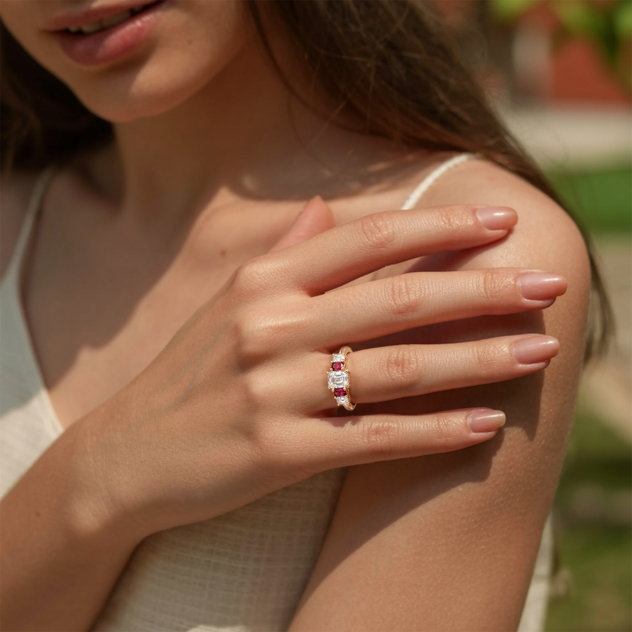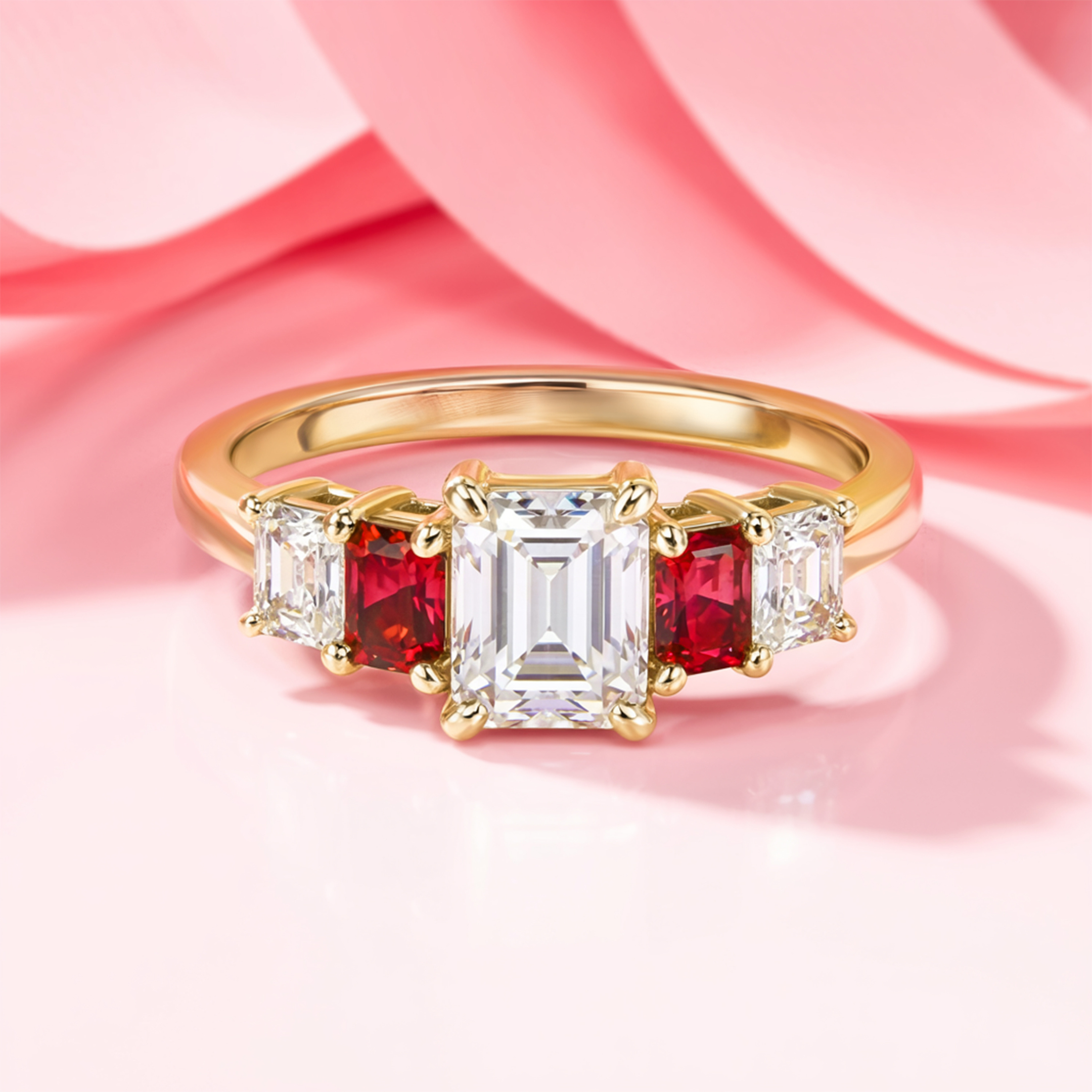The design features a magnificent 1-carat white emerald-cut moissanite as its center, beautifully flanked by two vibrant red emerald-cut moissanite accents a total of 3CT. Completing this distinguished look, two additional white emerald-cut stones frame the red accents, creating a captivating flow of light and color across the hand. Set in luxurious 18K Gold Vermeil, this ring is a statement of confidence and refined taste.