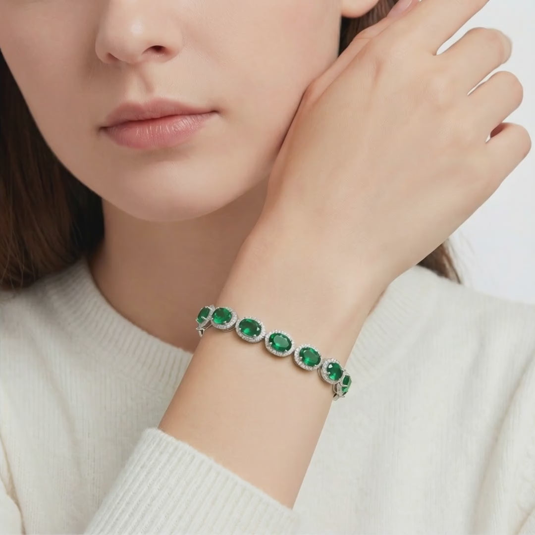 Mined emeralds are notoriously inclusion-heavy and fragile. We engineered a better way. This tennis bracelet features Simulated Emeralds, color-calibrated to the deep, vivid green of museum-grade stones. Every stone is precision-cut to ensure uniform brilliance and color matching across the entire piece—perfection that nature rarely delivers consistently.