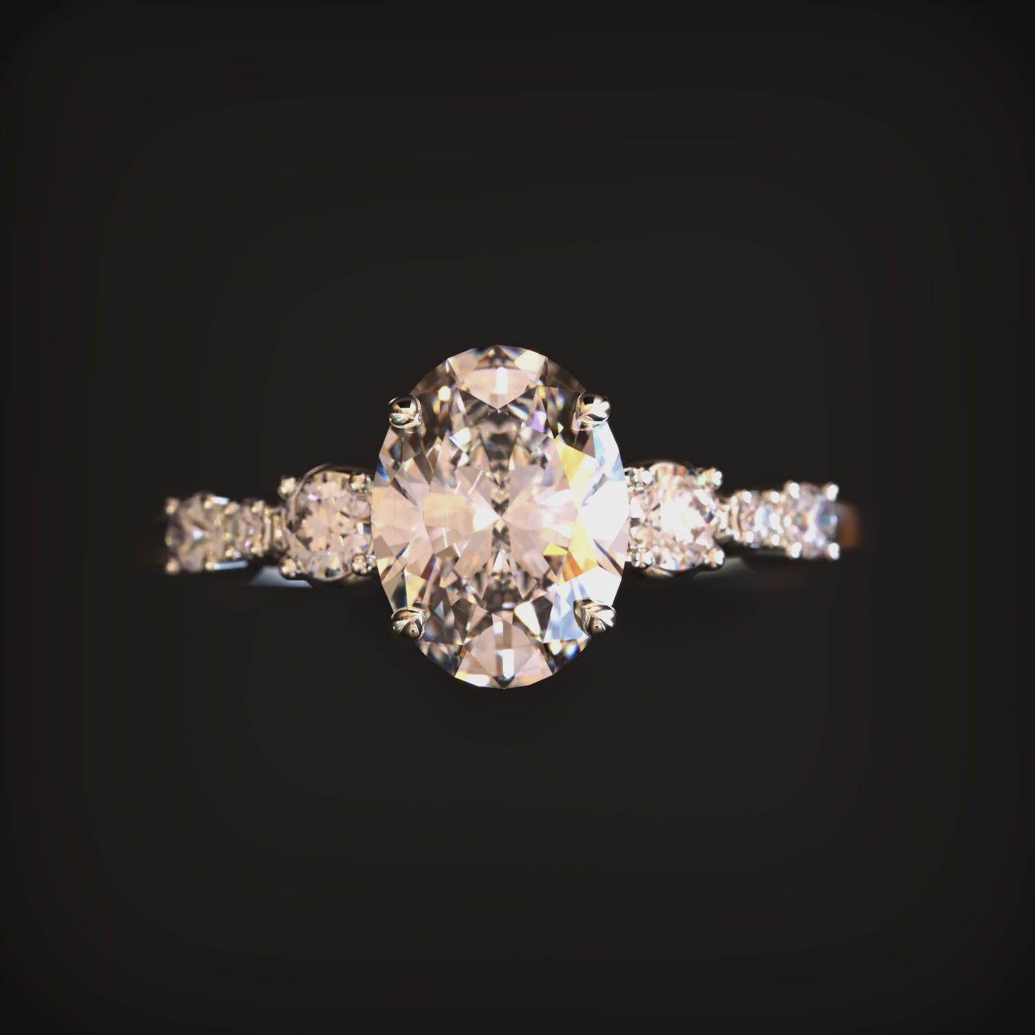 The Alina is a timeless token of love, featuring a perfectly cut 1CT oval moissanite that radiates warmth, clarity, and depth — just like her. It’s flanked by delicately set side stones that add brilliance from every angle, creating a silhouette that’s both graceful and unforgettable.