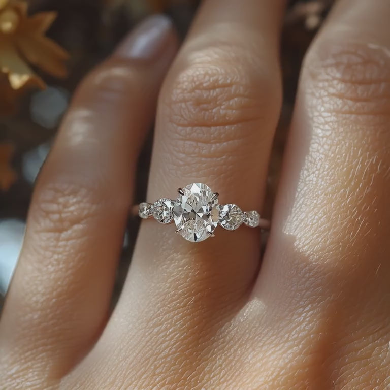 - CT Size: The Alina -Silver Features a 2.5 CT Oval Cut Moissanite. The side stones are round shape.