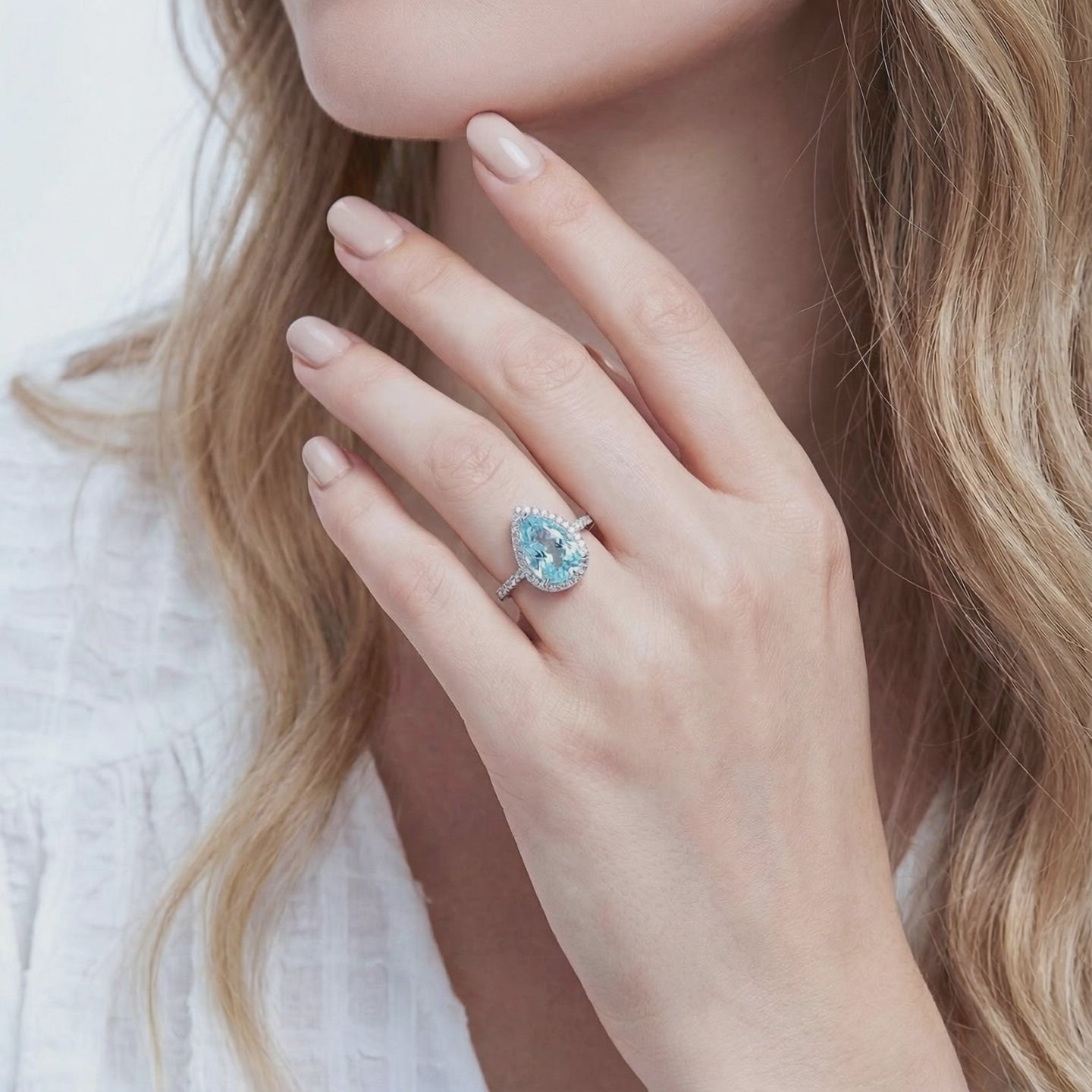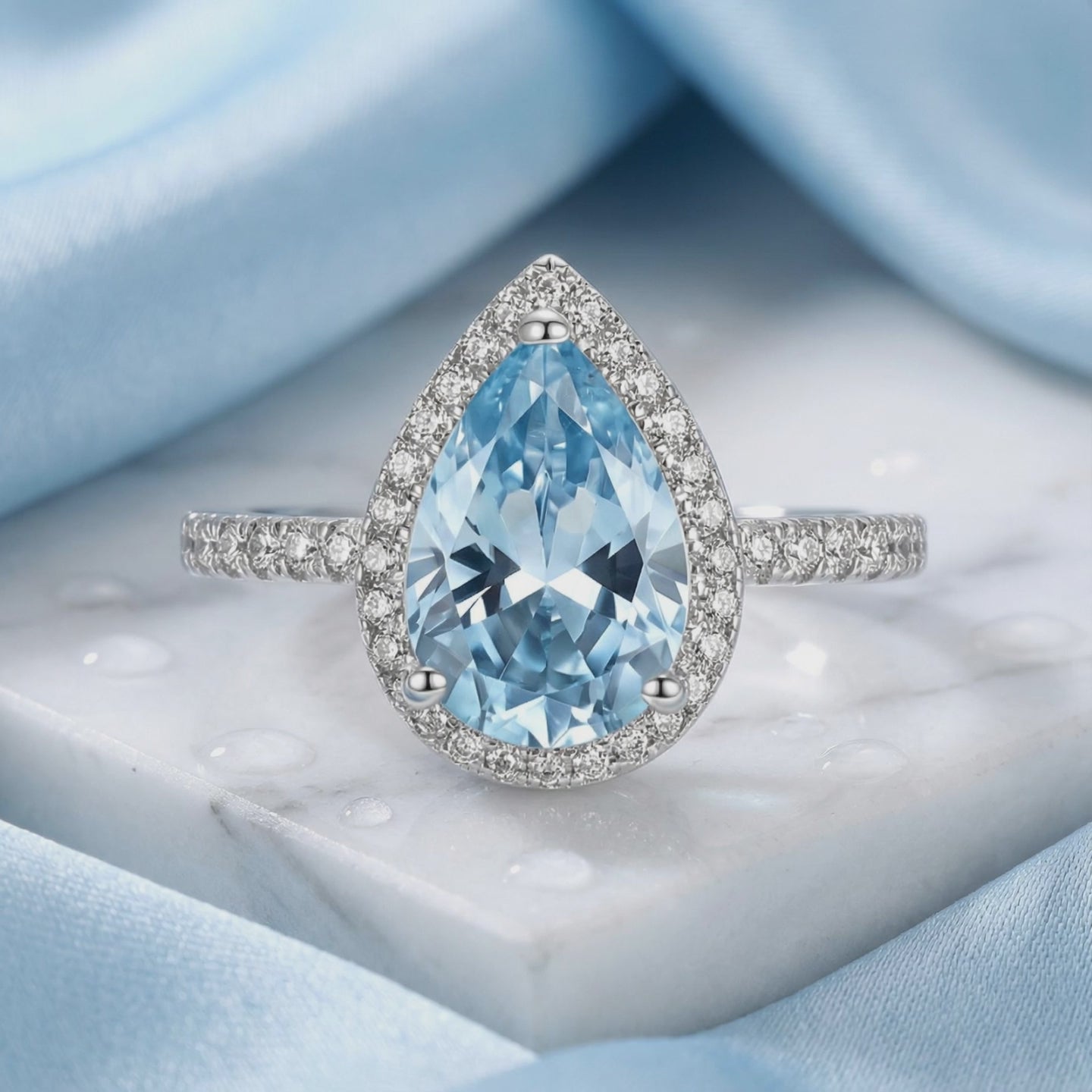 Nature rarely delivers the perfect sky-blue saturation required for a museum-grade Aquamarine. We engineered it. This March birthstone ring features a precision-cut Simulated Aquamarine in a high-impact pear silhouette, surrounded by a halo of A5-grade stones for maximum refractive fire.