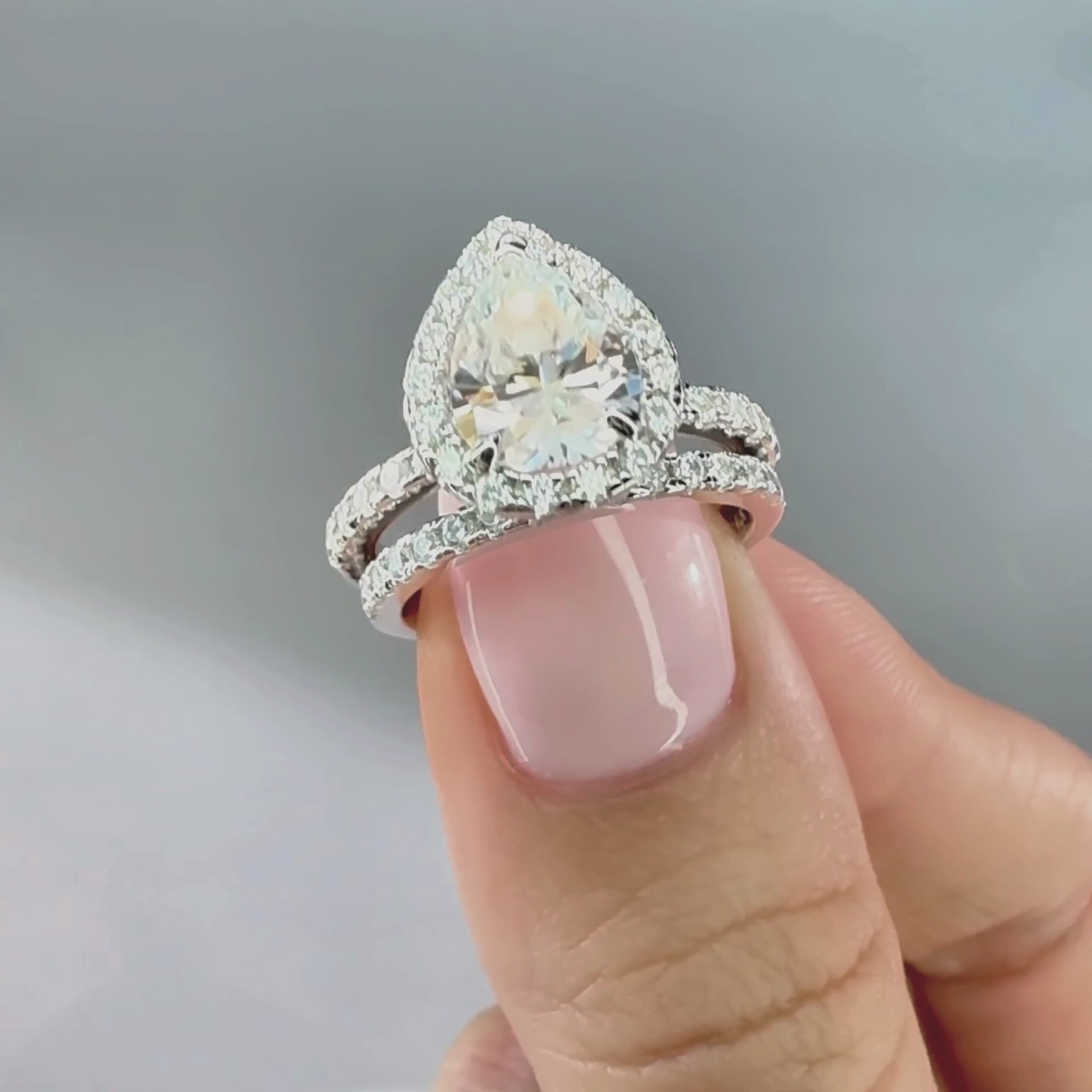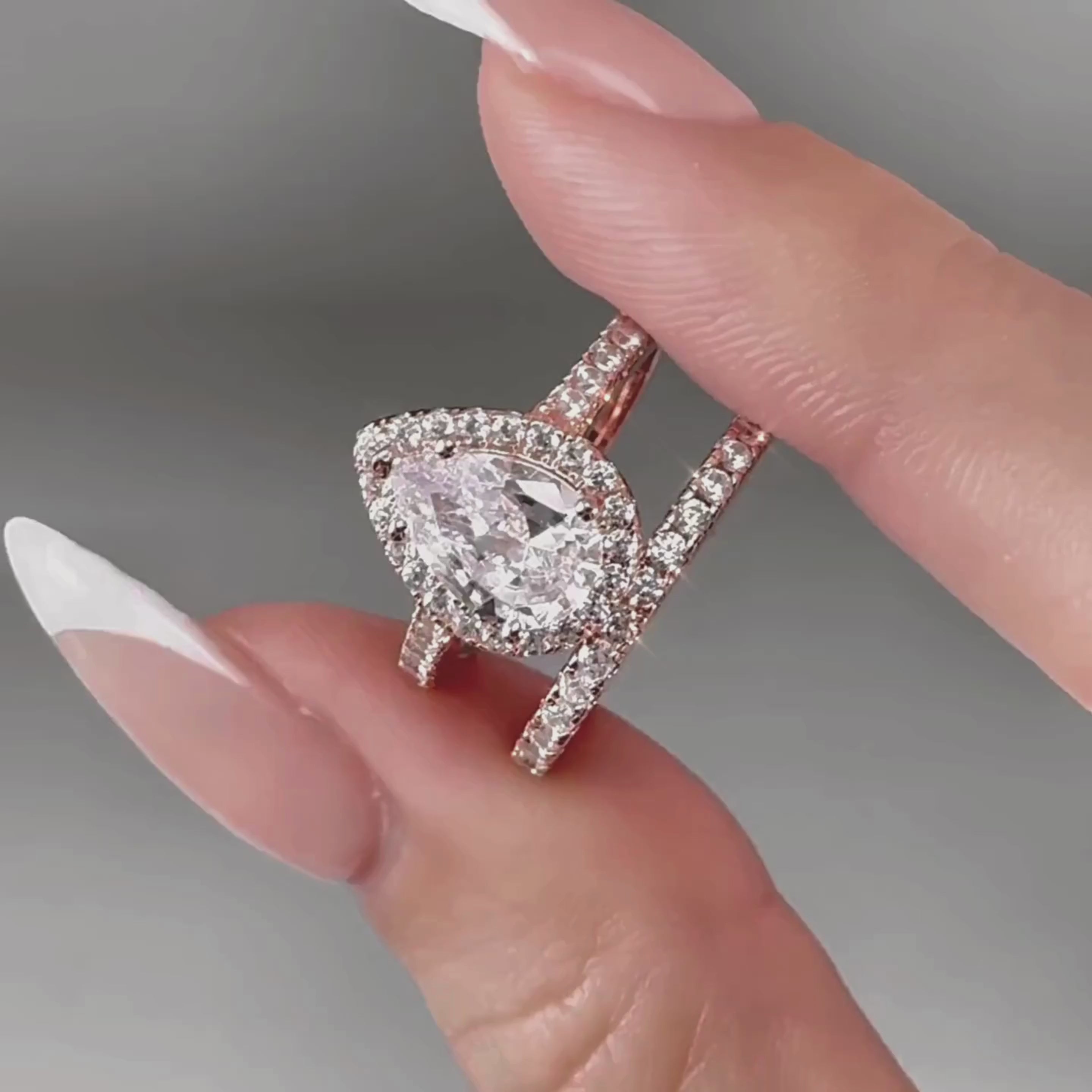 The Allure-Rose dazzles with its classic double band half-eternity halo design. Made from S925 sterling silver with 18K Rose Gold plating, it features a pear-cut center lab grown diamond and side stones in prong and channel settings. The light will bounce and sparkle from this ring from every angle.