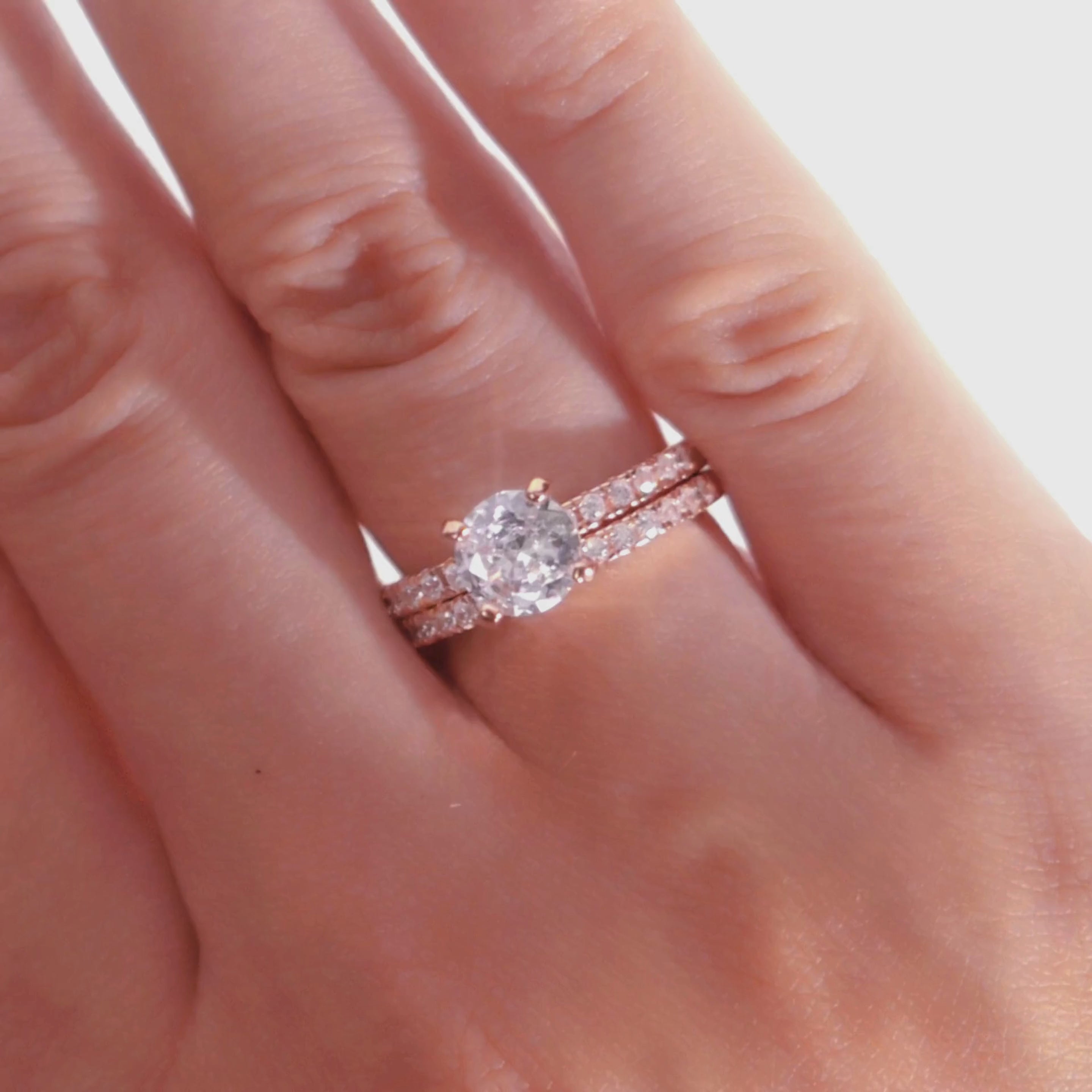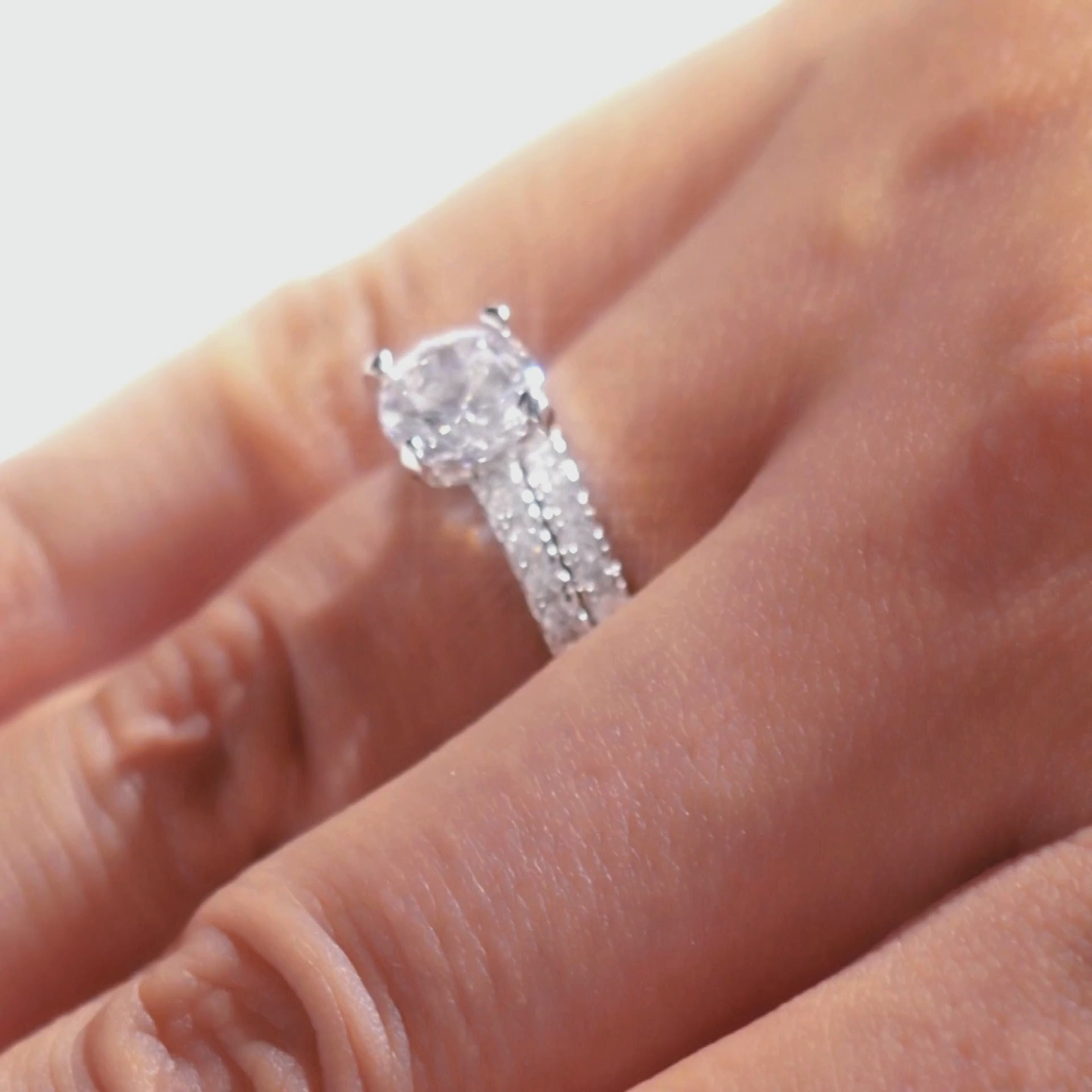 The Angel combines classic elegance with modern brilliance. This classic double band eternity ring set is crafted from S925 sterling silver, featuring a brilliant round-cut 1CT moissanite stone in a prong setting. The bands are adorned with shimmering simulated diamonds to ensure sparkle from every angle.