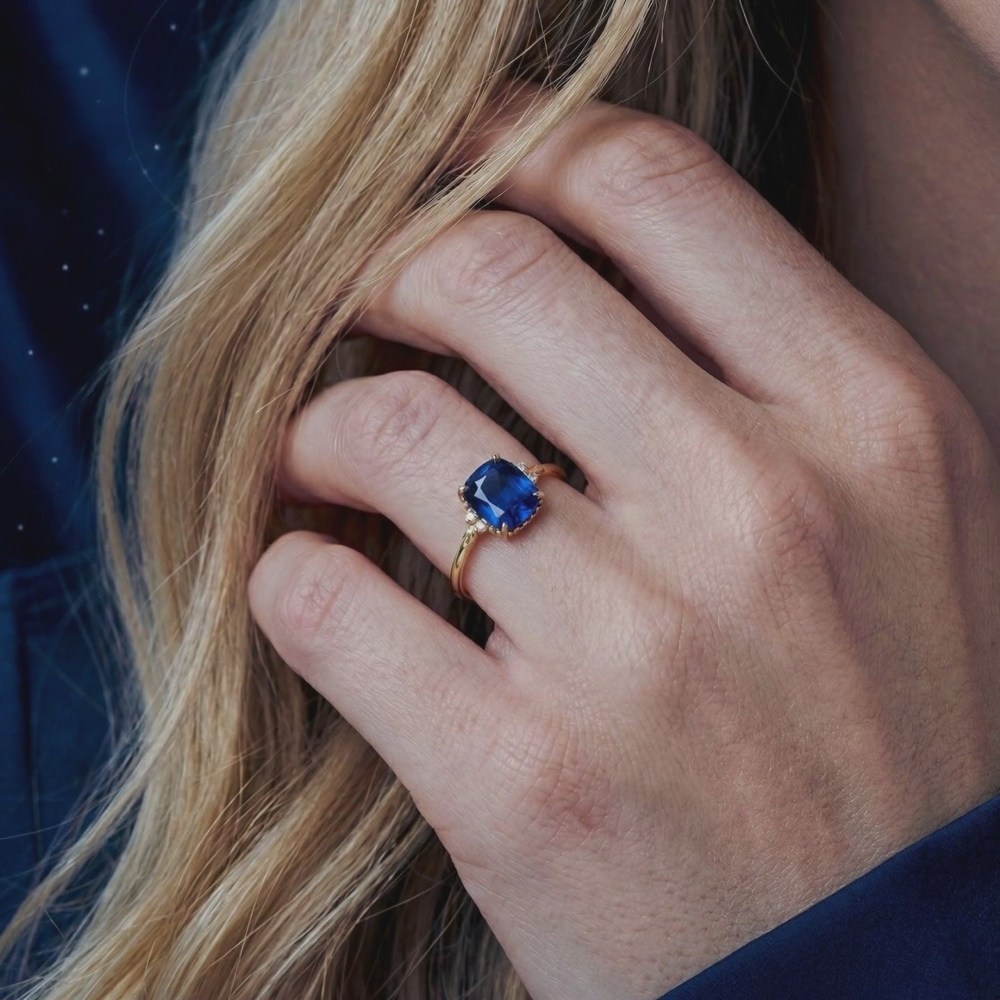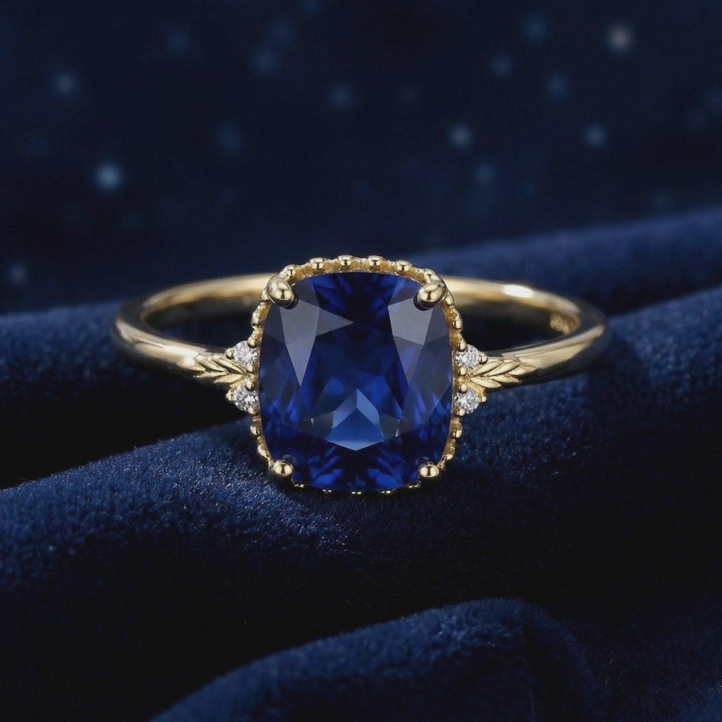 - Stone: Cushion Cut Simulated Sapphire (A5 Grade)