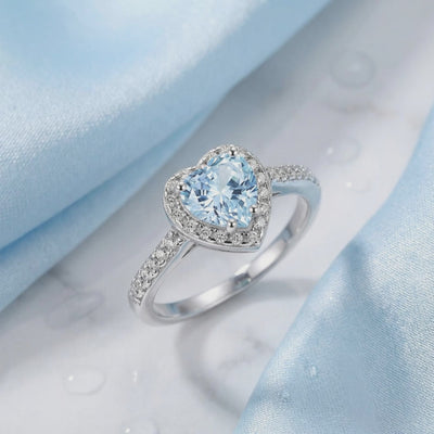Nature rarely delivers the perfect shade of light blue aquamarine without significant inclusions. We engineered it. This heart-shaped ring features a precision-cut Simulated Aquamarine center stone, color-calibrated to the absolute ideal of the March birthstone. Surrounded by a halo of A5-grade stones, it offers the visual physics and refractive fire of a museum-grade heirloom.
