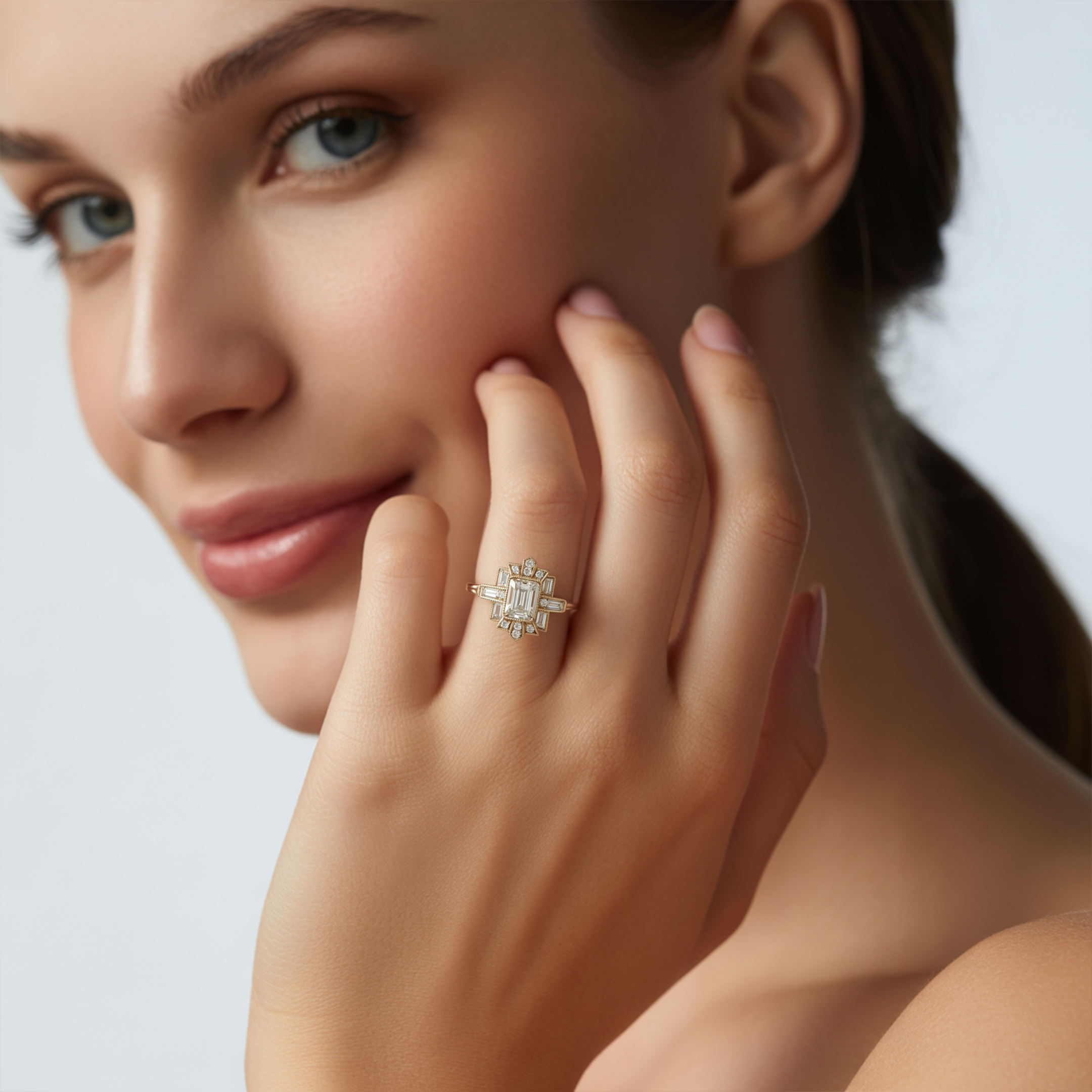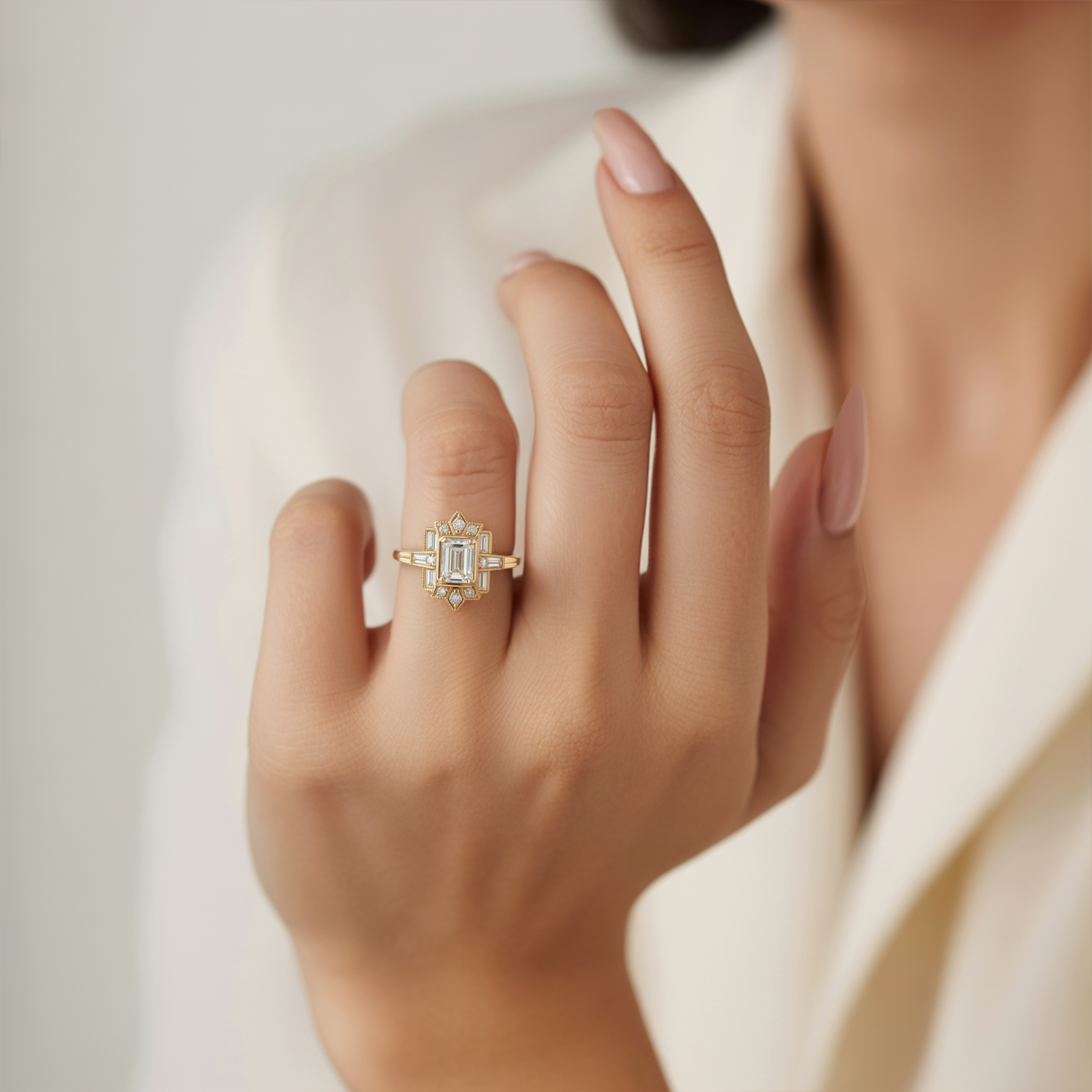 The Astraea ring is a breathtaking tribute to classic elegance, featuring a brilliant emerald cut center stone enveloped by a distinctive Art Deco-inspired bezel halo.