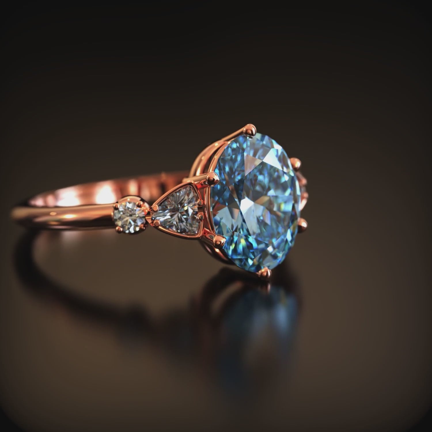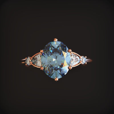 The Aurora Belle is a ring that holds stories within it. Its oval-cut moissanite center stone has a depth that draws the eye, reminiscent of clear, deep waters.