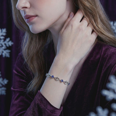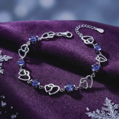 Mined tanzanite is often plagued by uneven color and visible inclusions. This heart-linked bracelet features Simulated Tanzanite, engineered to capture the exact deep blue-violet trichroic shift of a museum-grade heirloom. Every stone is color-calibrated for maximum saturation and precision-cut to ensure consistent brilliance across the entire piece.