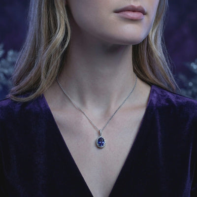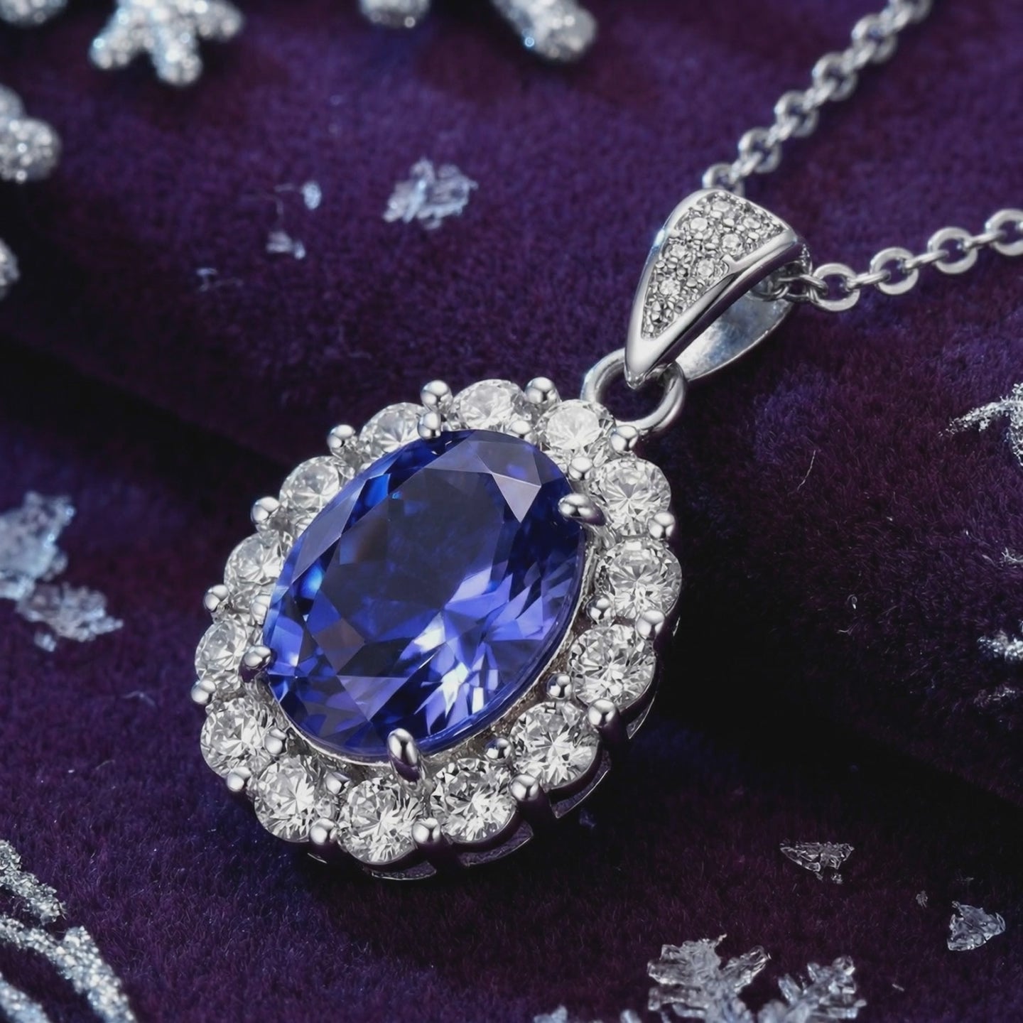 Mined tanzanite is famously rare and often plagued by internal inclusions that dull its natural fire. This necklace features a Simulated Tanzanite, color-calibrated to achieve the legendary deep blue-violet saturation with trichroic shifting hues found in museum-grade stones. Precision-cut in a classic oval shape for maximum light return and edge-to-edge brilliance.