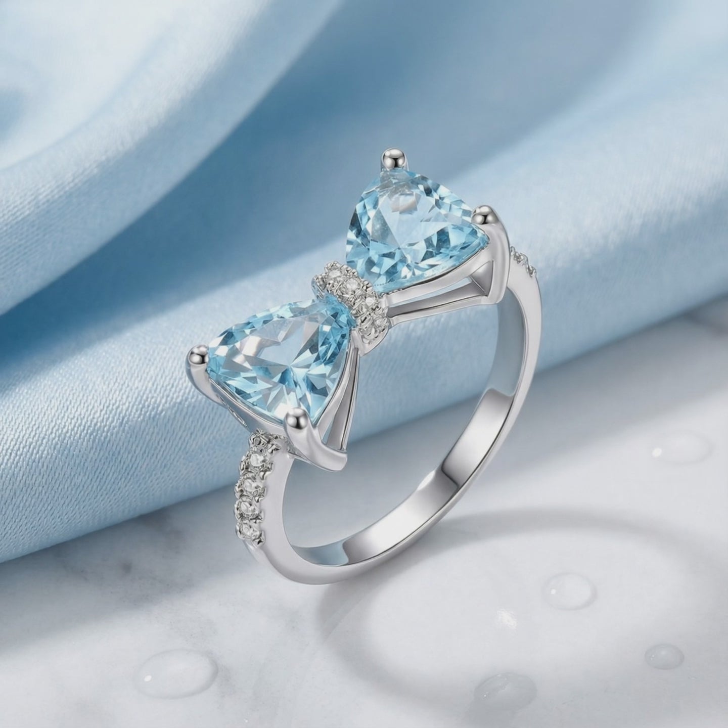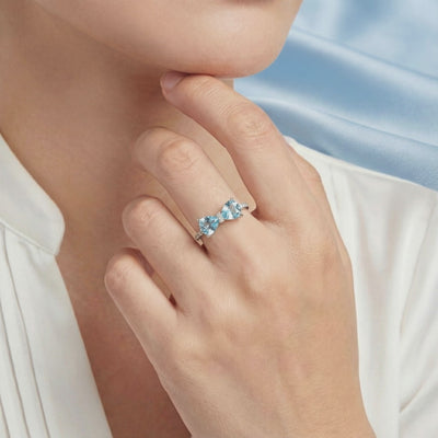 Mined aquamarines are often pale, inclusion-heavy, or prohibitively expensive in museum-grade saturation. This bypass ring features dual trillion-cut Simulated Aquamarines, precision-engineered to achieve the ideal light blue hue that nature rarely delivers with such consistency. The bow-tie silhouette is more than an aesthetic choice; it is a display of visual physics, designed to maximize light return from every angle.