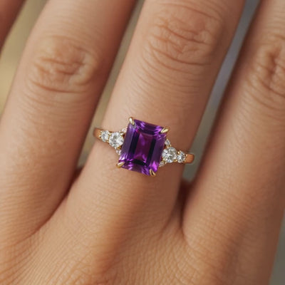 Let's talk about The Bella Jewel - this ring is not messing around. At its heart sits an emerald-cut moissanite in a captivating shade of purple, exuding a royal elegance that will command attention. It's got the kind of sparkle that makes diamonds do a double-take, and it comes with a price tag that won't break the bank. Royal elegance. The rich purple tone exudes luxury and individuality.
